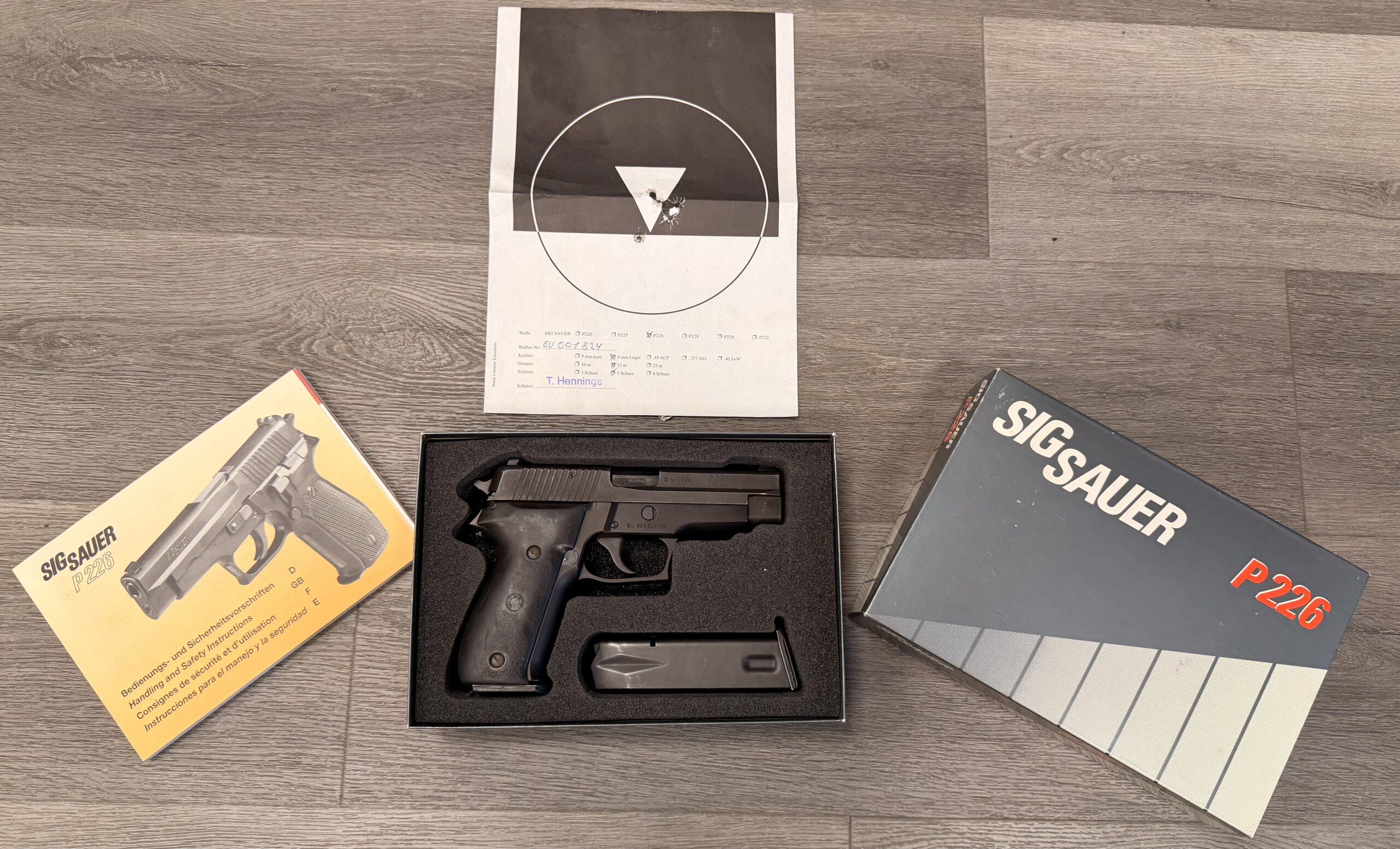 We’ve just received German SIG Sauer P226s in 9mm Parabellum / 9x19mm with the factory original box, Serial Number EU001824.
