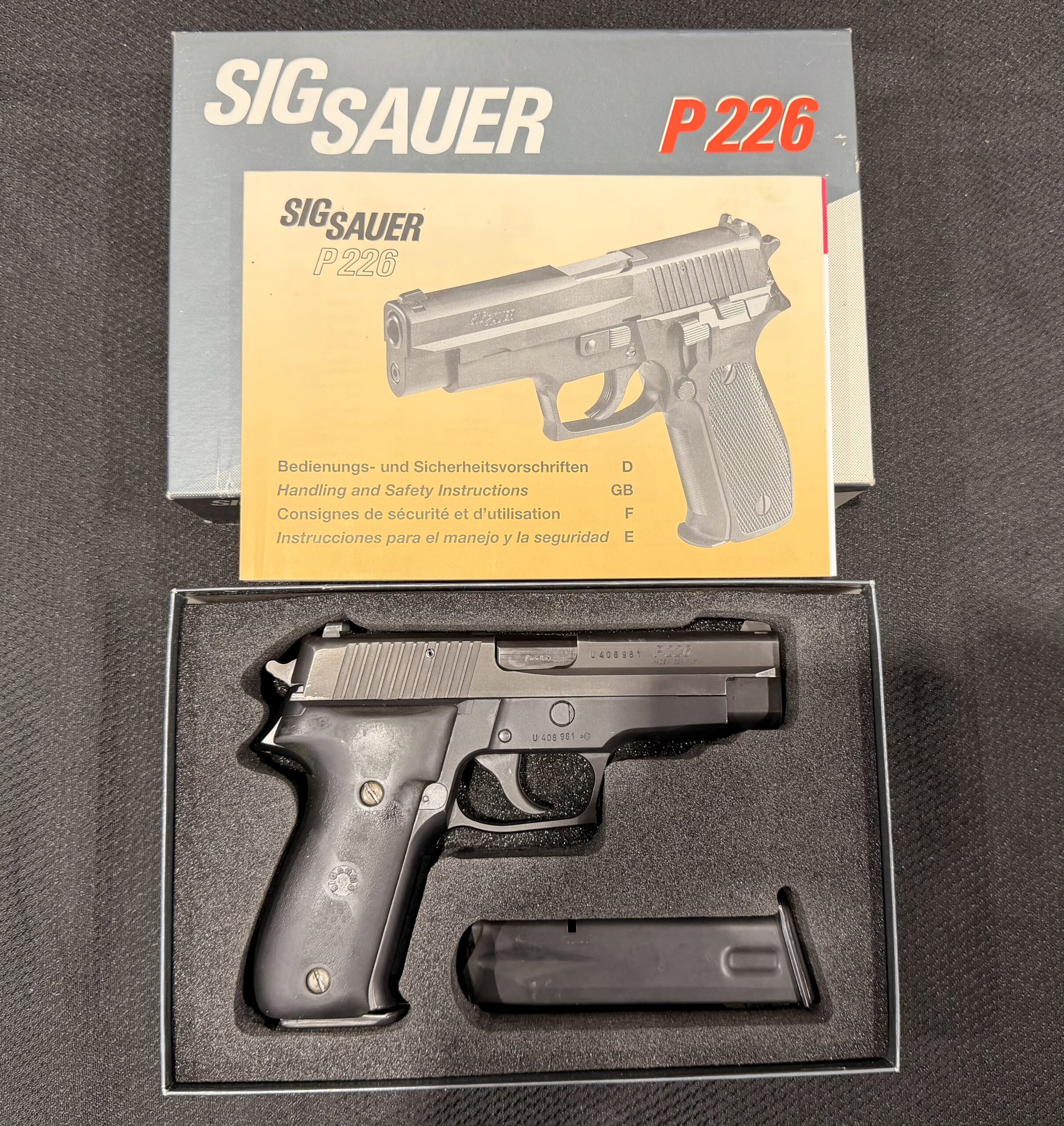 We’ve just received German SIG Sauer P226 in 9mm Parabellum / 9x19mm with the factory original box, Serial Number U408961.