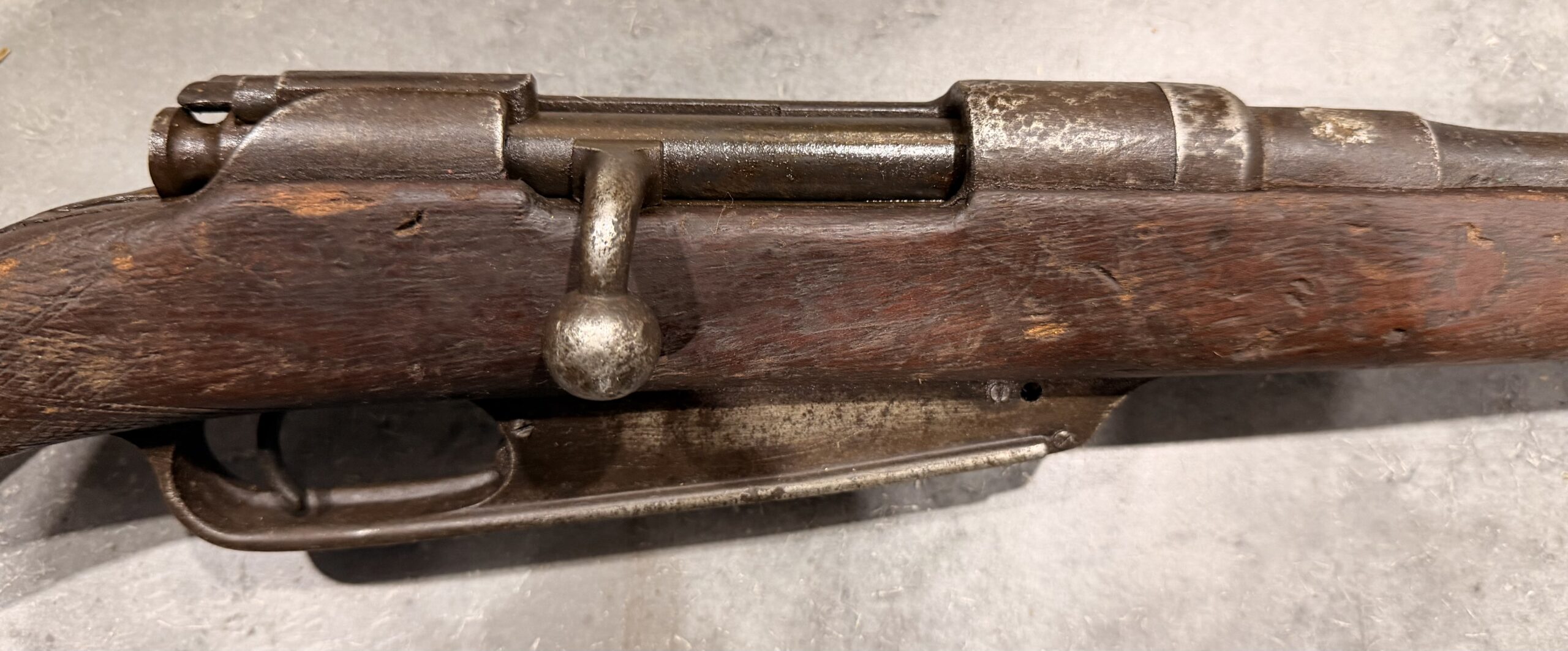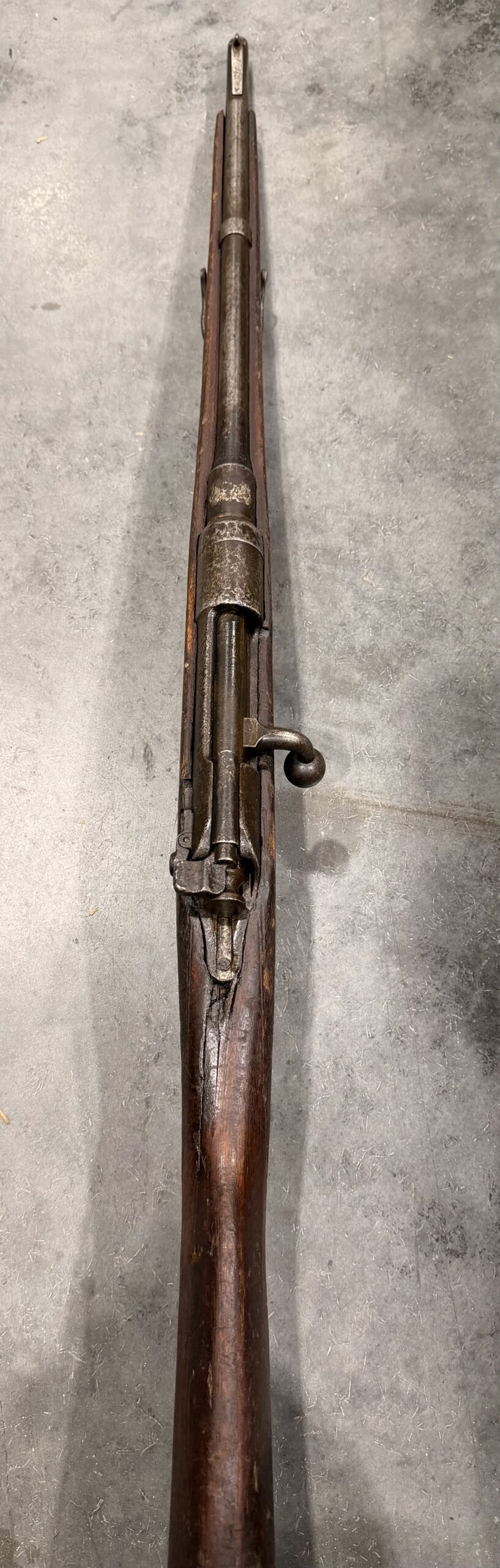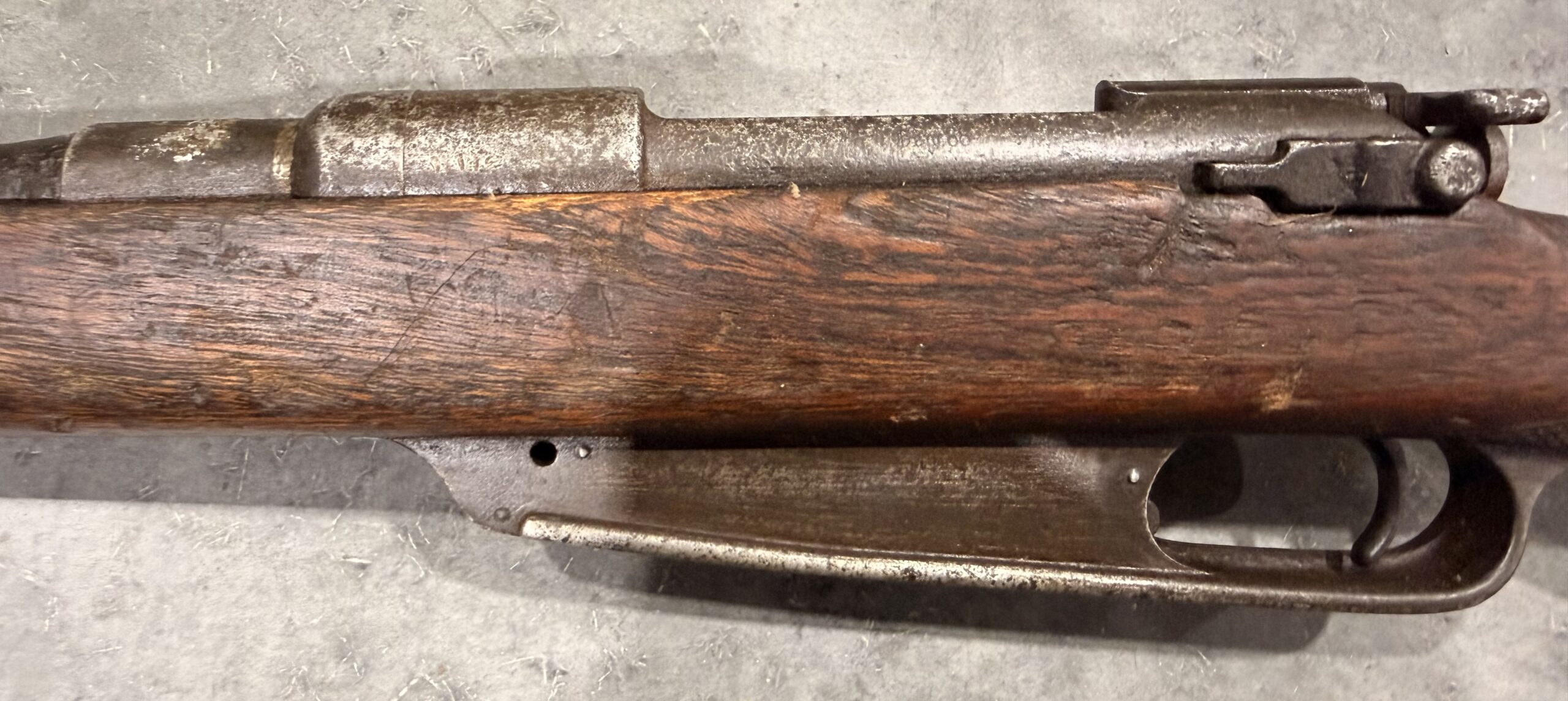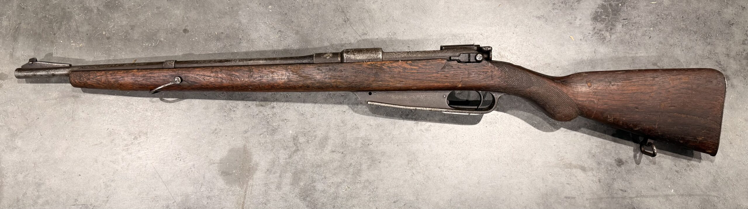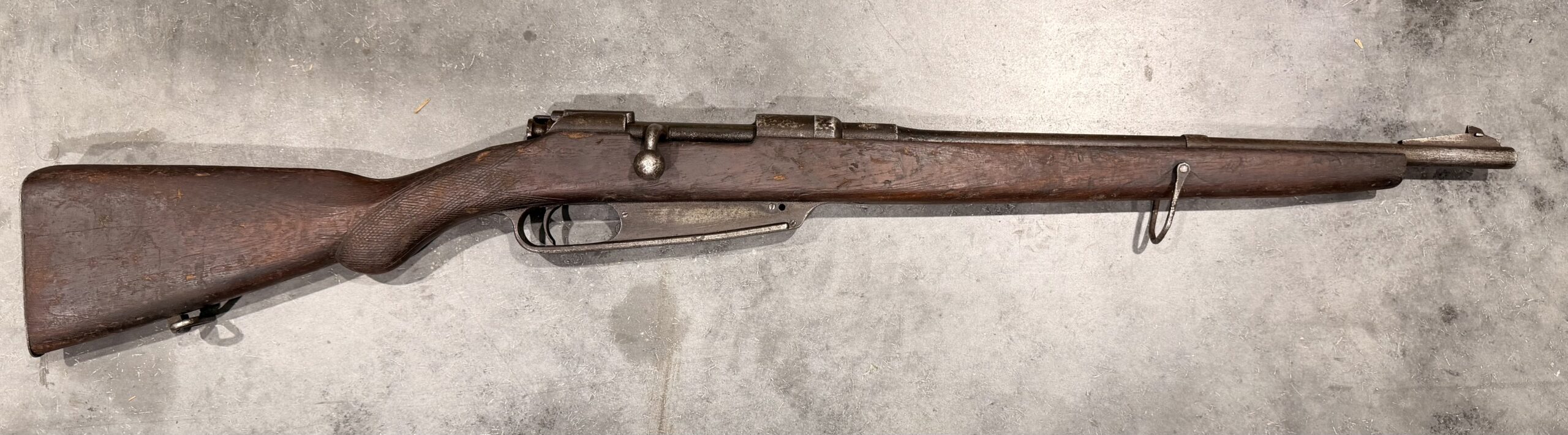 Please note that the manufacturer markings are not visible, and the barrel has been shortened. The rifle features a hand-stamped serial number and a custom-made stock.