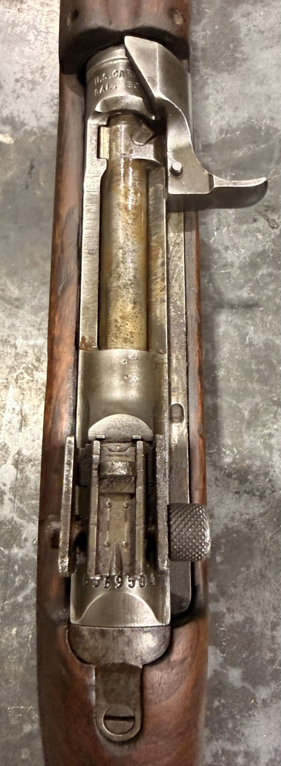 This carbine features a Type III rear sight, a Type II front barrel band and push-button safety. The receiver, barrel, and trigger group are in good condition.
