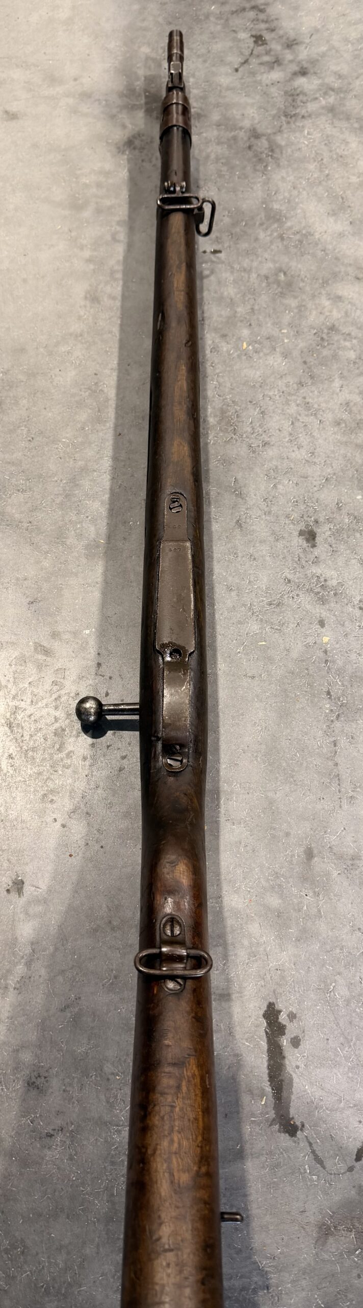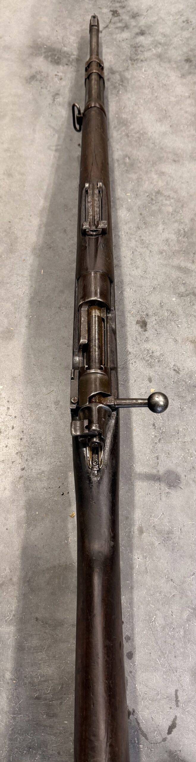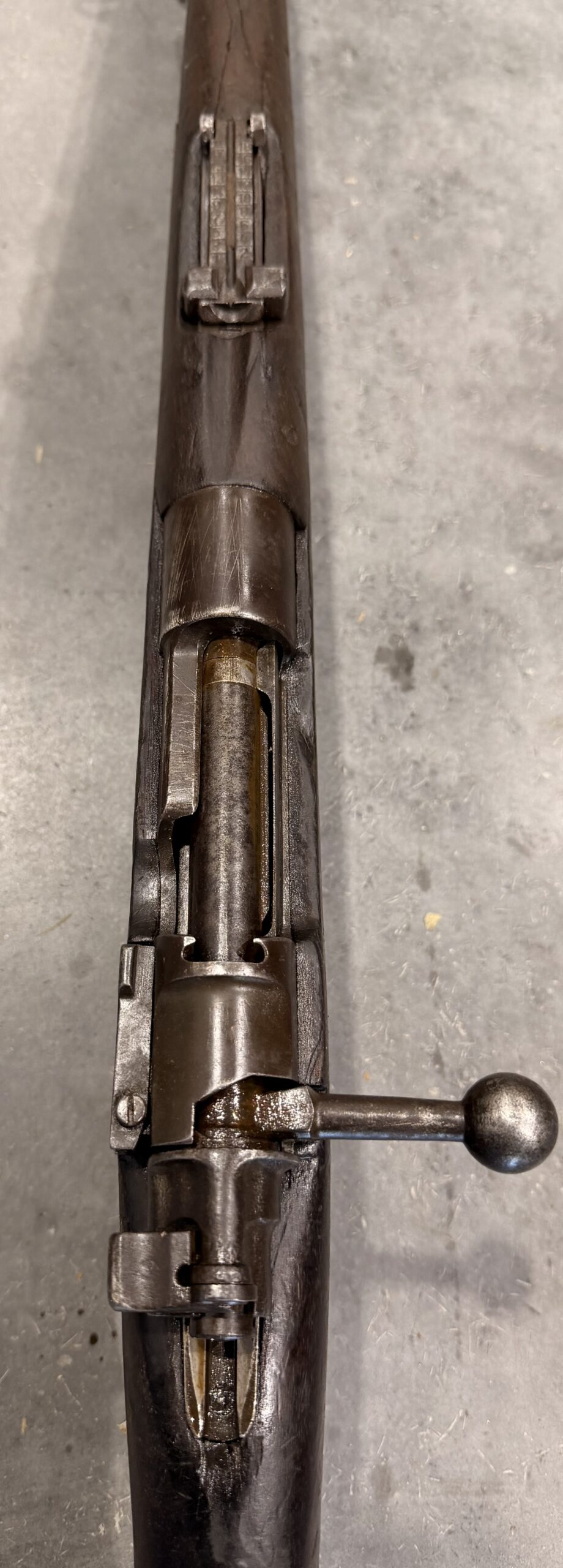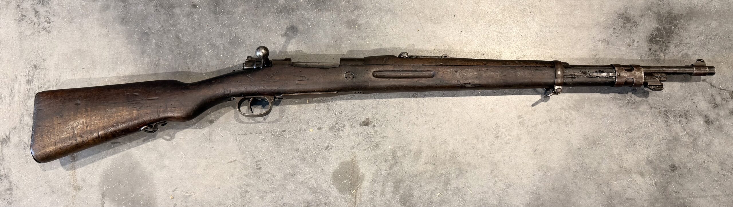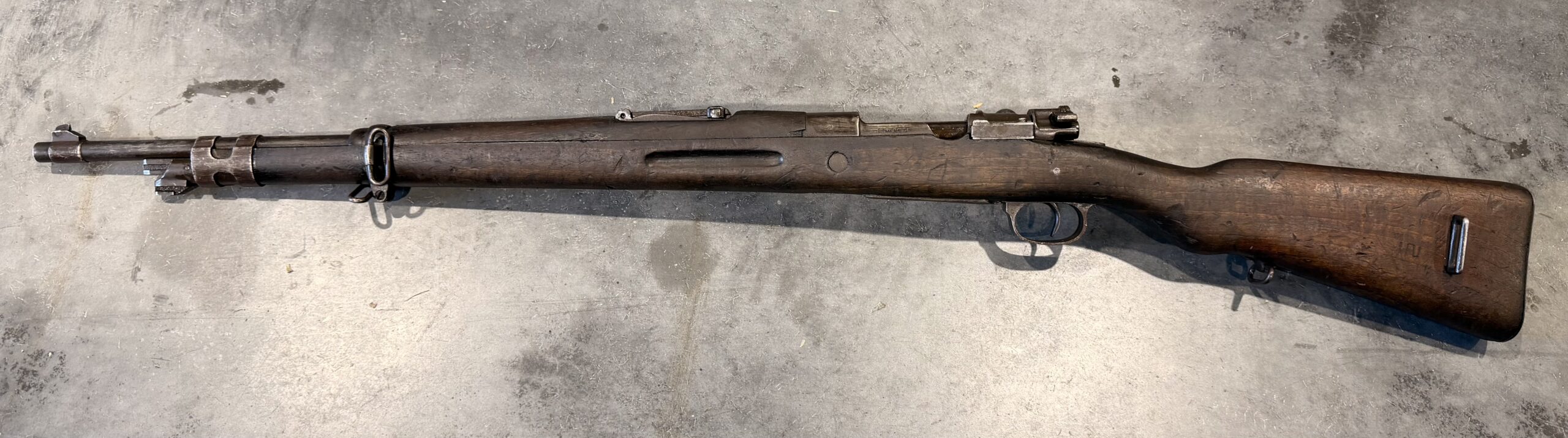 This rifle is chambered in 8×57 Mauser. The bore is in very good condition, the rifle has been thoroughly disassembled, cleaned, and is fully functional. The wood is in good condition, showing typical handling wear with some dings and scratches. The rifle is not matching numbers. Please note there are a few cracks at the upper handguard.