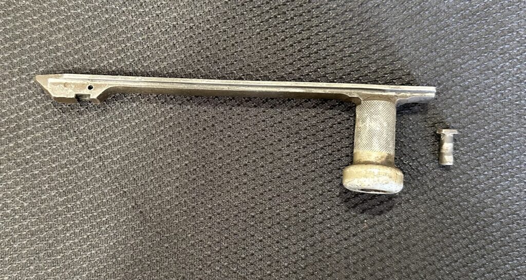This MAG 58 charging handle with pin, Lot Number 1, is in original good condition. It features an aluminum handle.