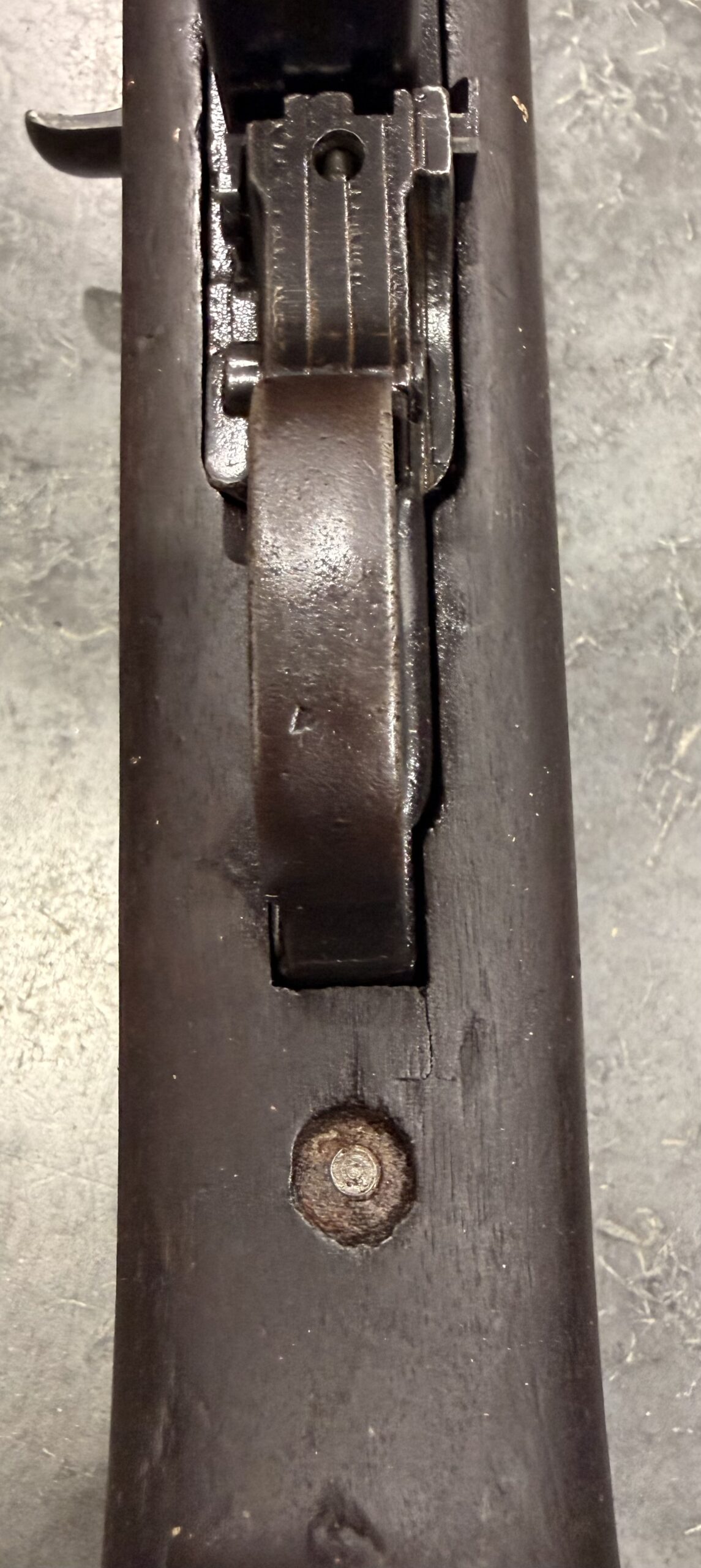 The stock is in very good overall shape. Please note a very small crack in the stock near the trigger.