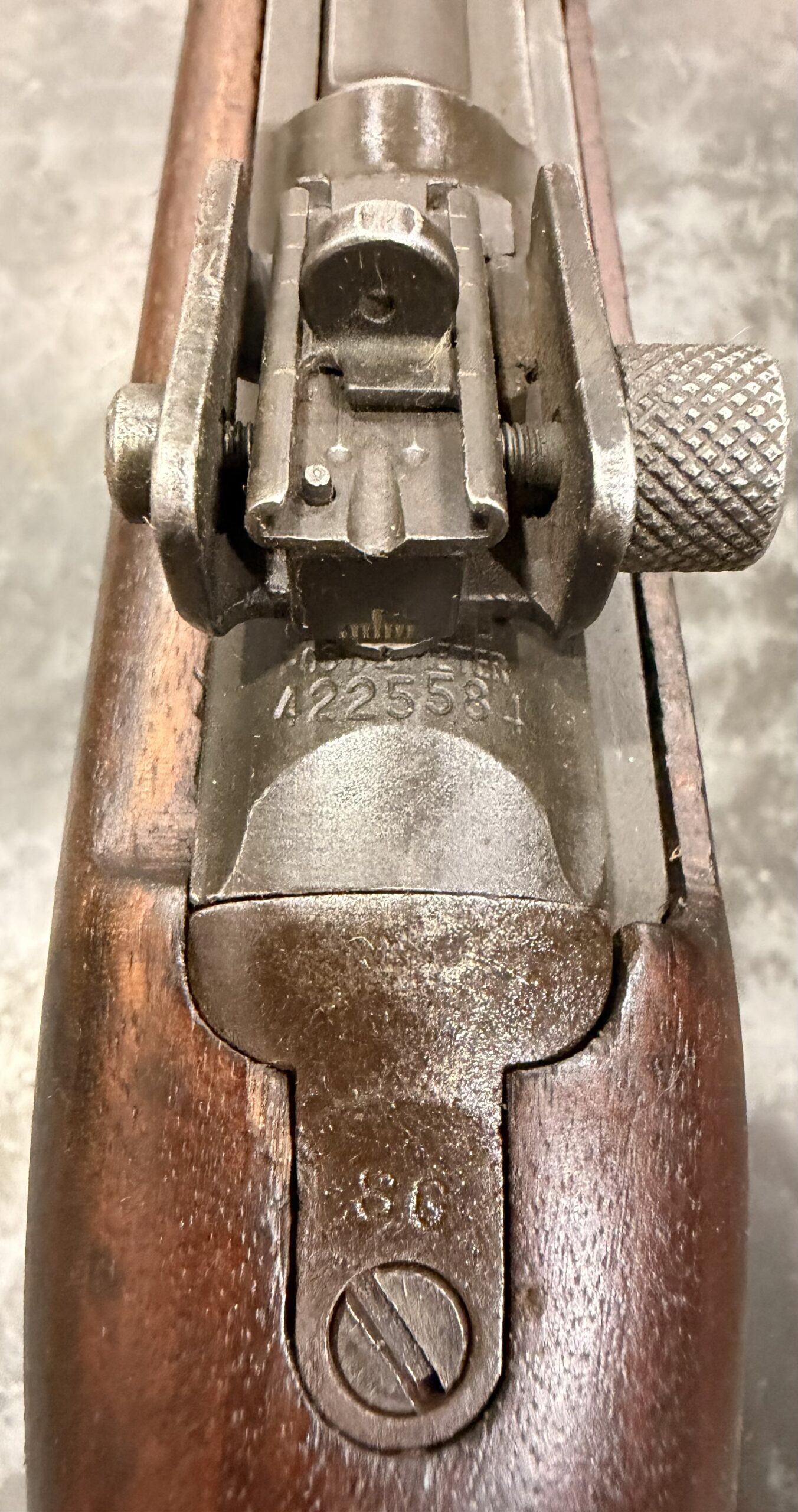 This carbine features a Type 2 rear sight and a Type 3 front barrel band. The receiver, barrel, and trigger group are in good condition.