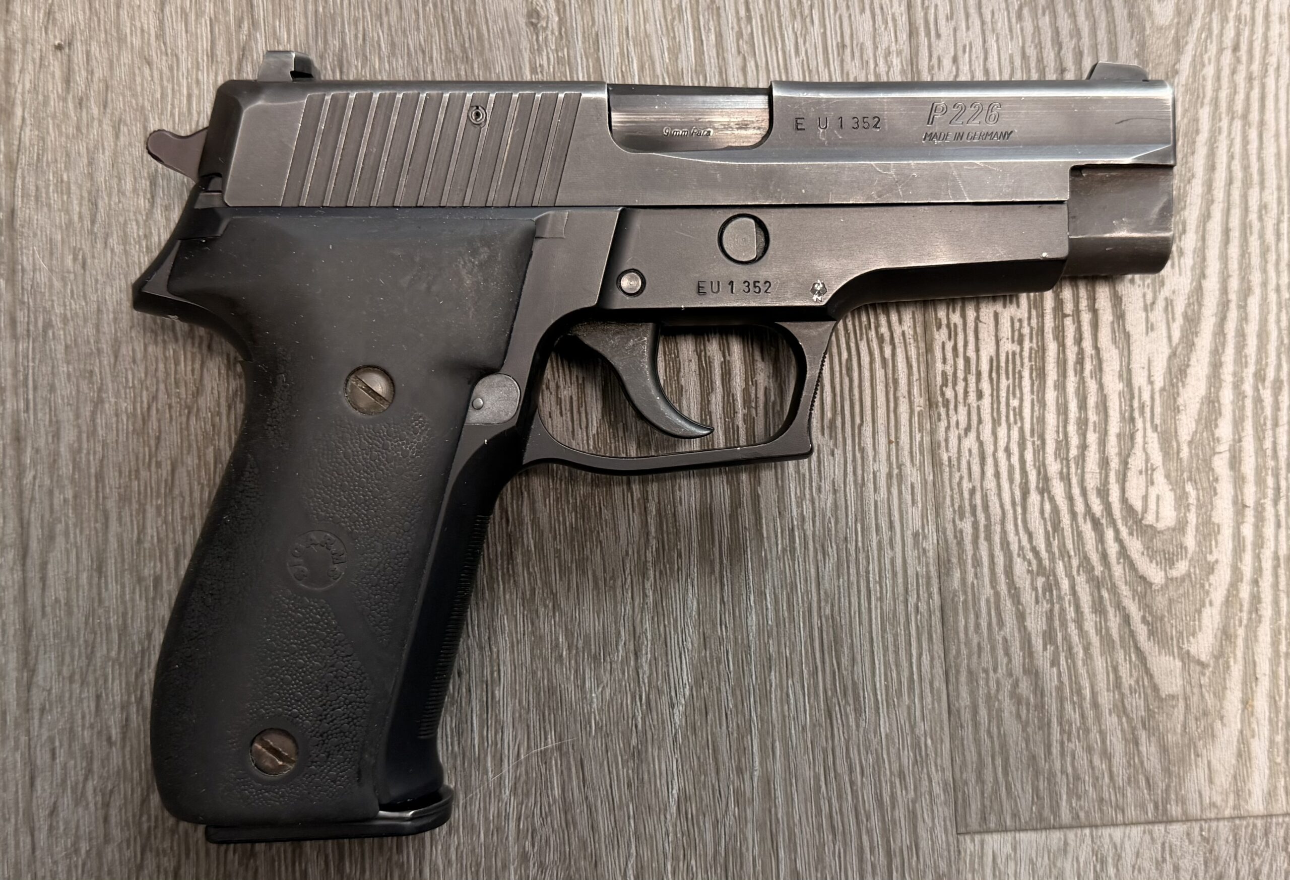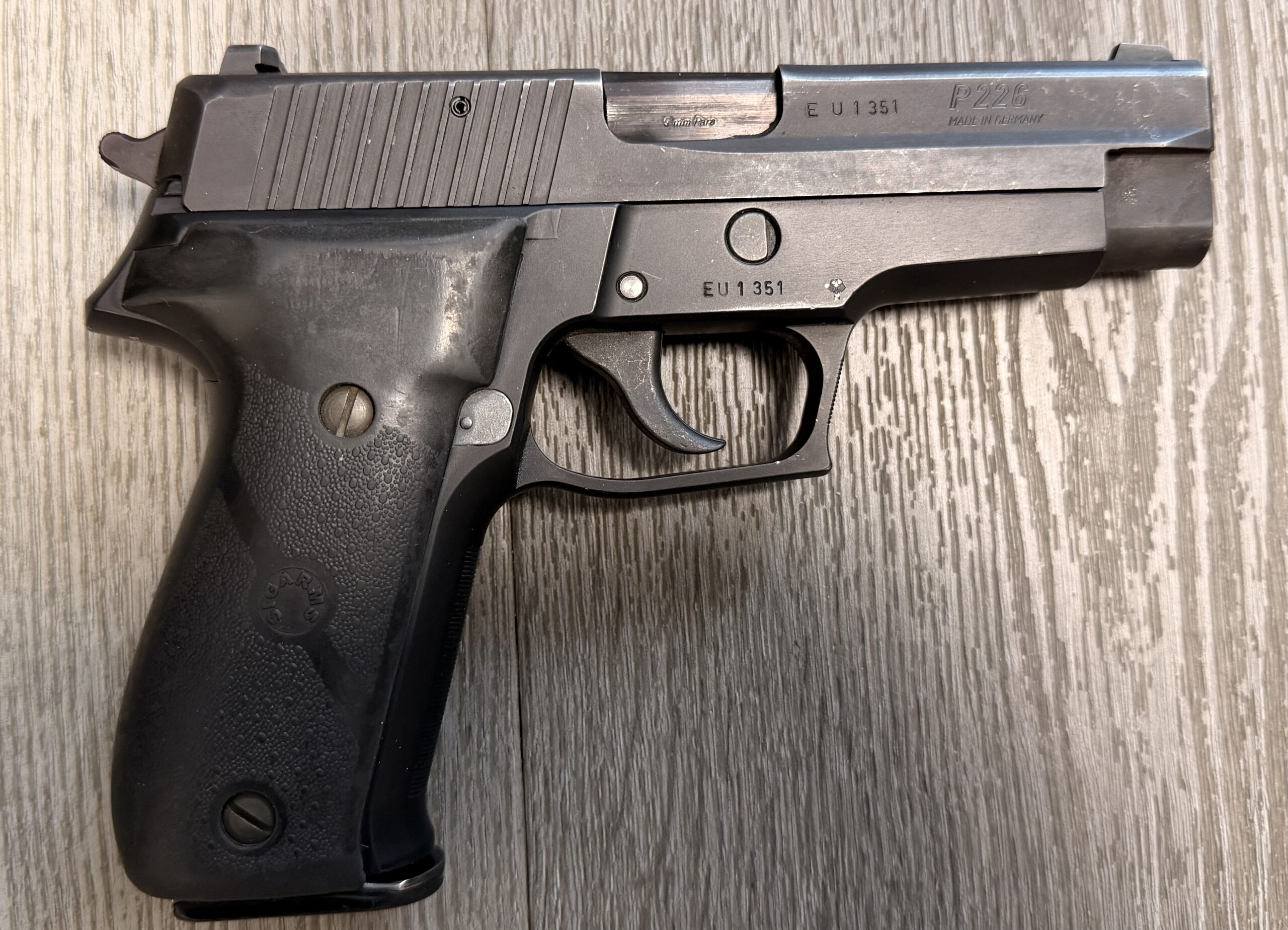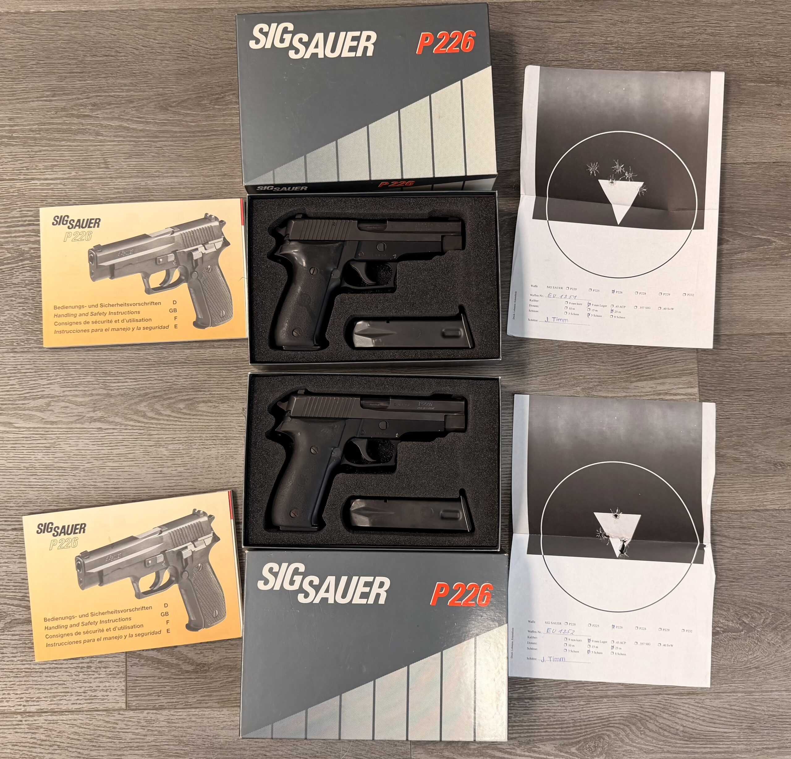 We are offering a matched pair of German-manufactured SIG Sauer P226 pistols chambered in 9mm Parabellum (9×19mm), featuring sequential serial numbers EU1351 and EU1352.
