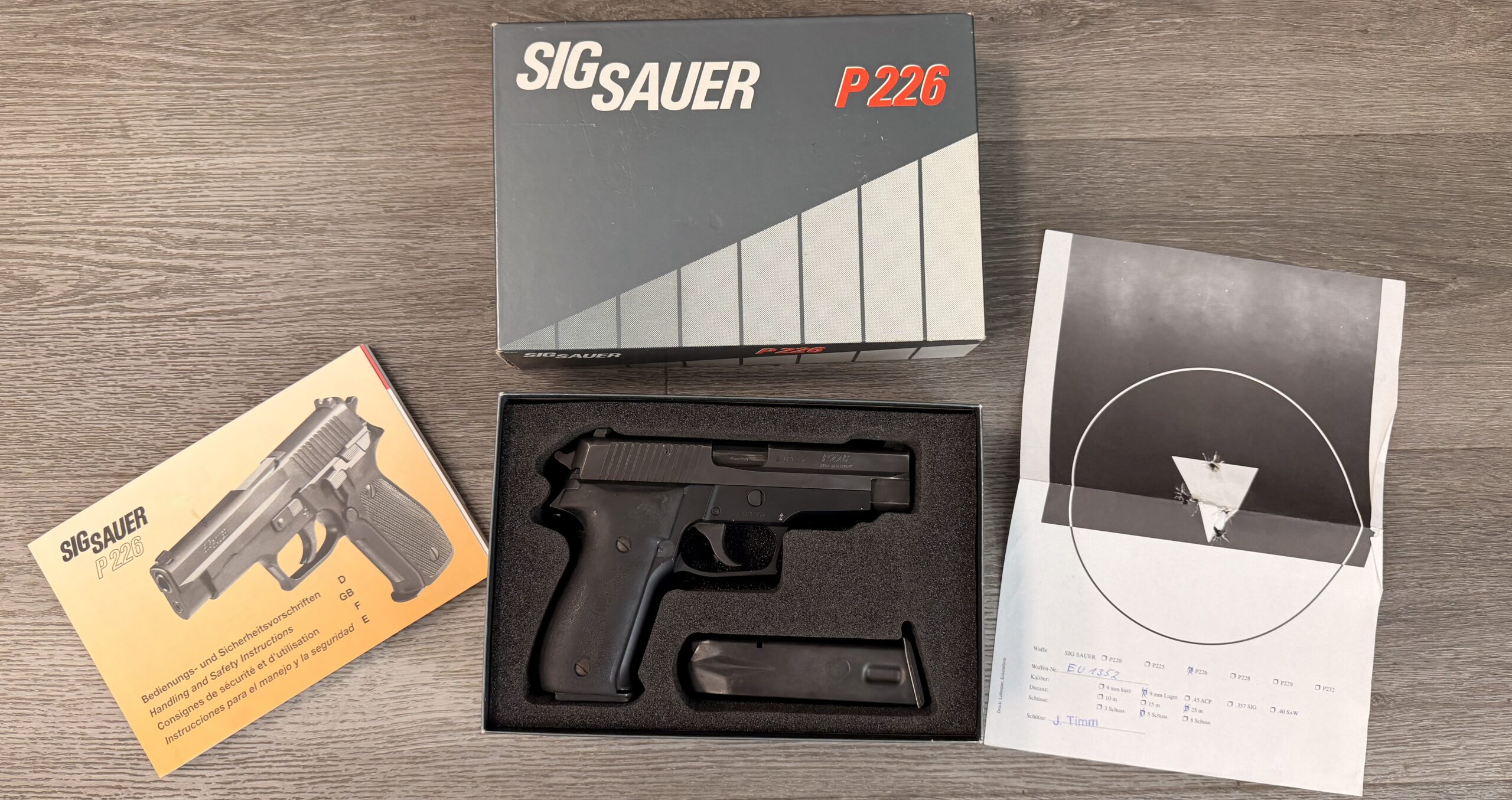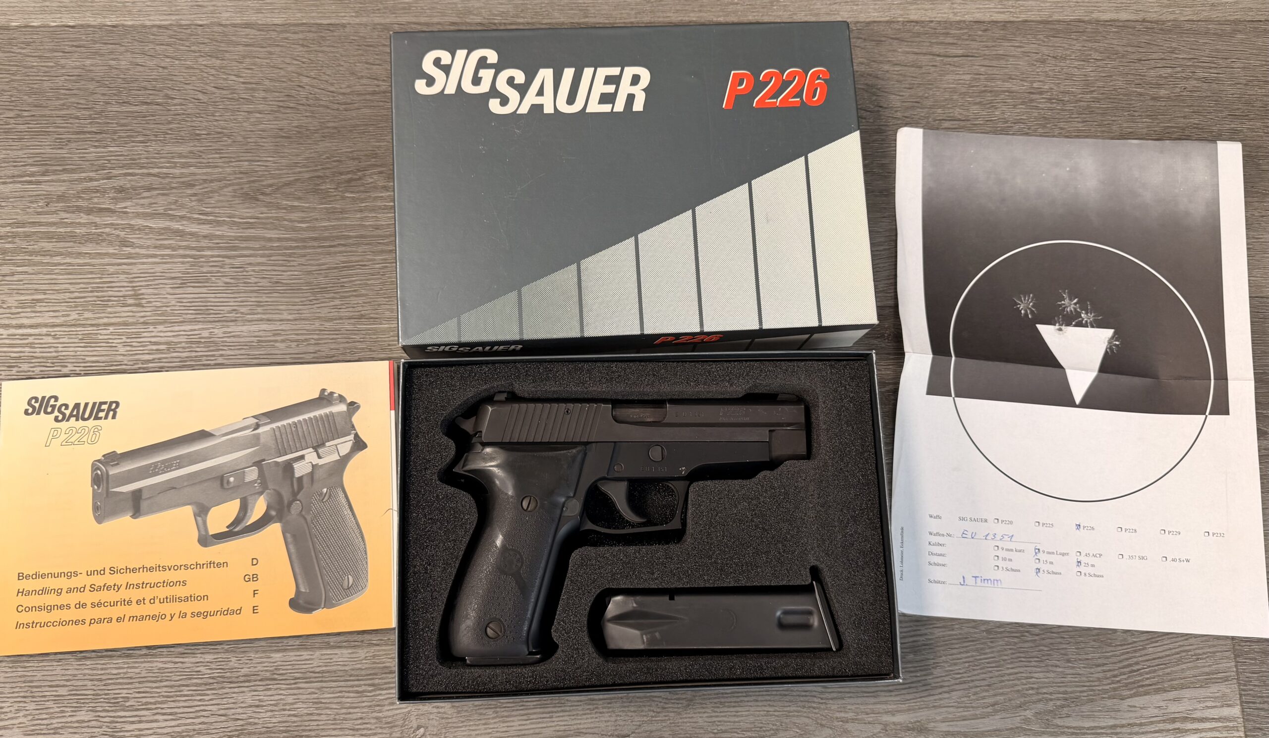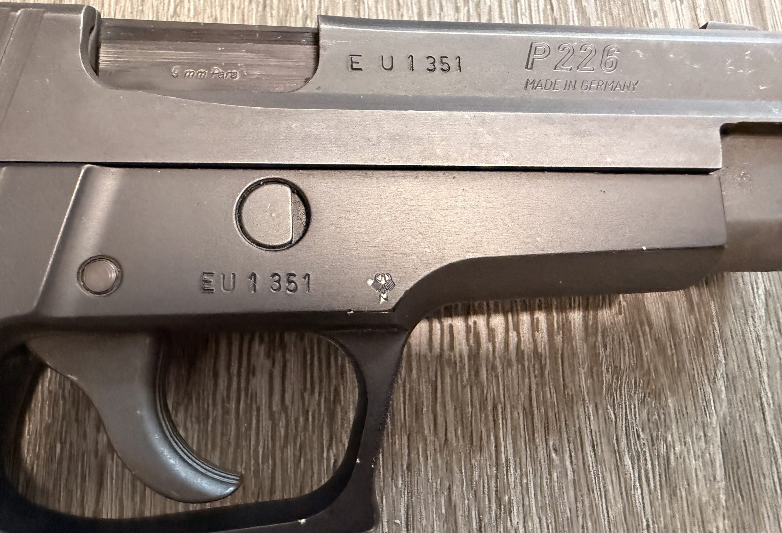 We are offering a matched pair of German-manufactured SIG Sauer P226 pistols chambered in 9mm Parabellum (9×19mm), featuring sequential serial numbers EU1351 and EU1352.