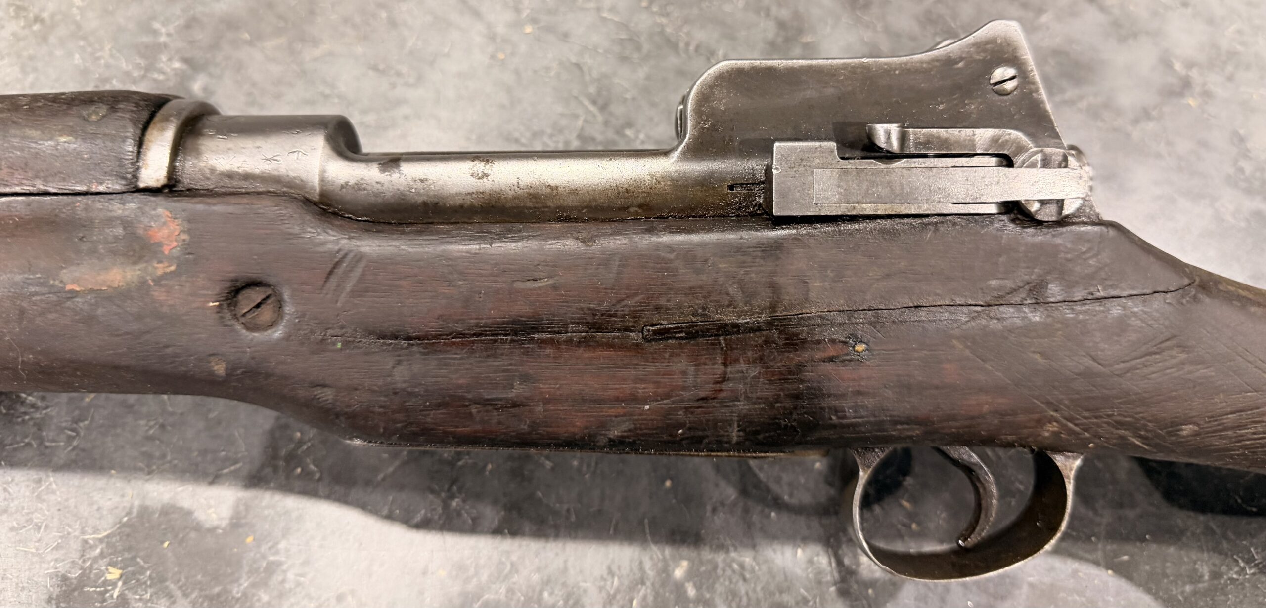 Manufactured by Remington. This rifle is complete and has passed a basic function test. The bore is in poor condition. The barrel is unmarked. The wood is in overall fair condition, showing typical handling wear, including dings and scratches.