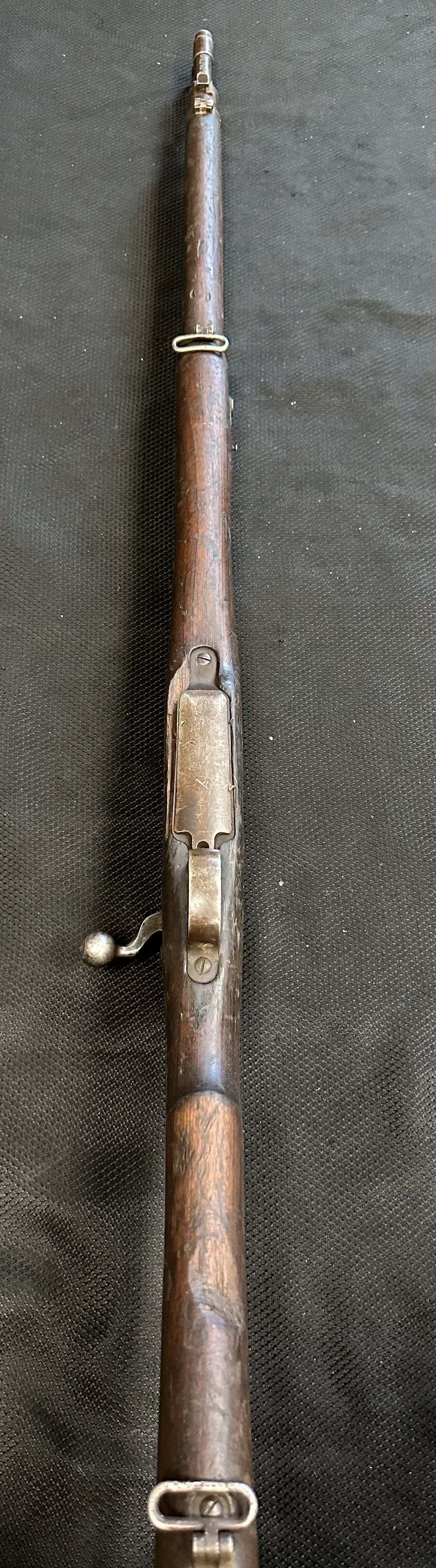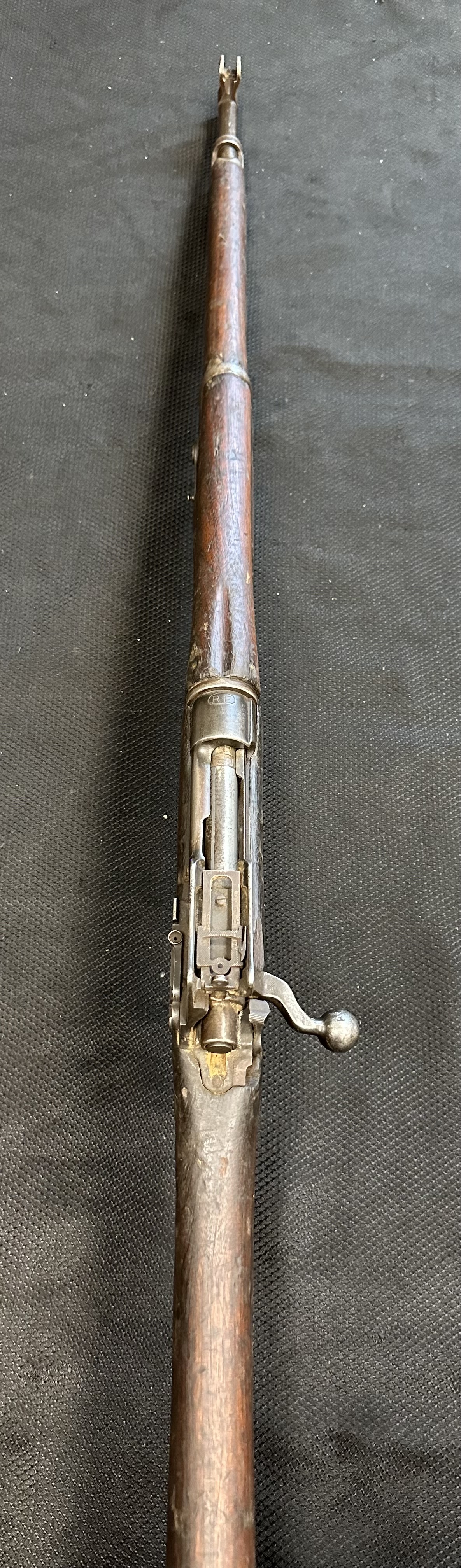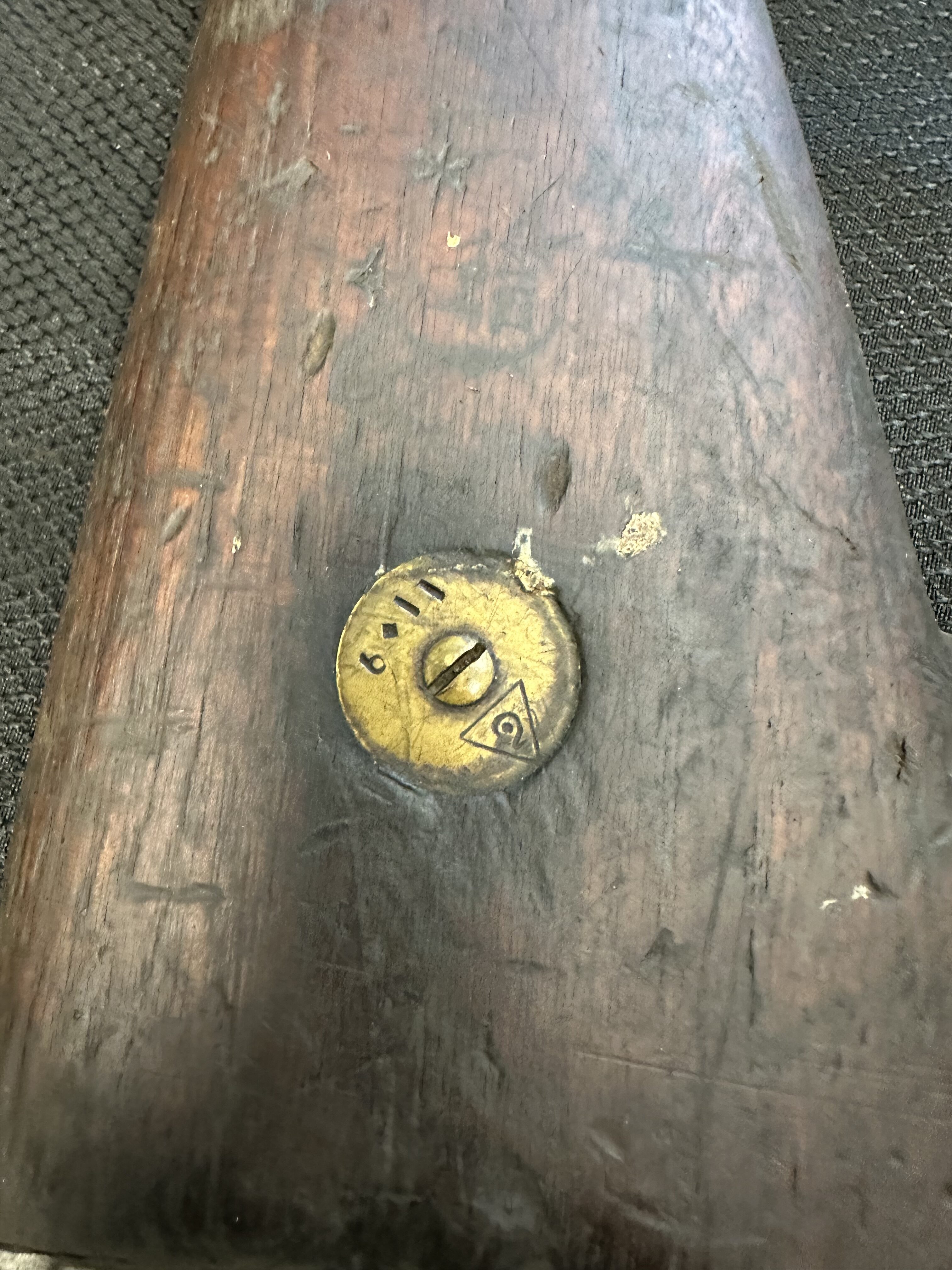 Please note: a small piece of wood is missing near the magazine on the right side, and there is a small chunk of wood missing underneath the buttstock, behind the wrist.