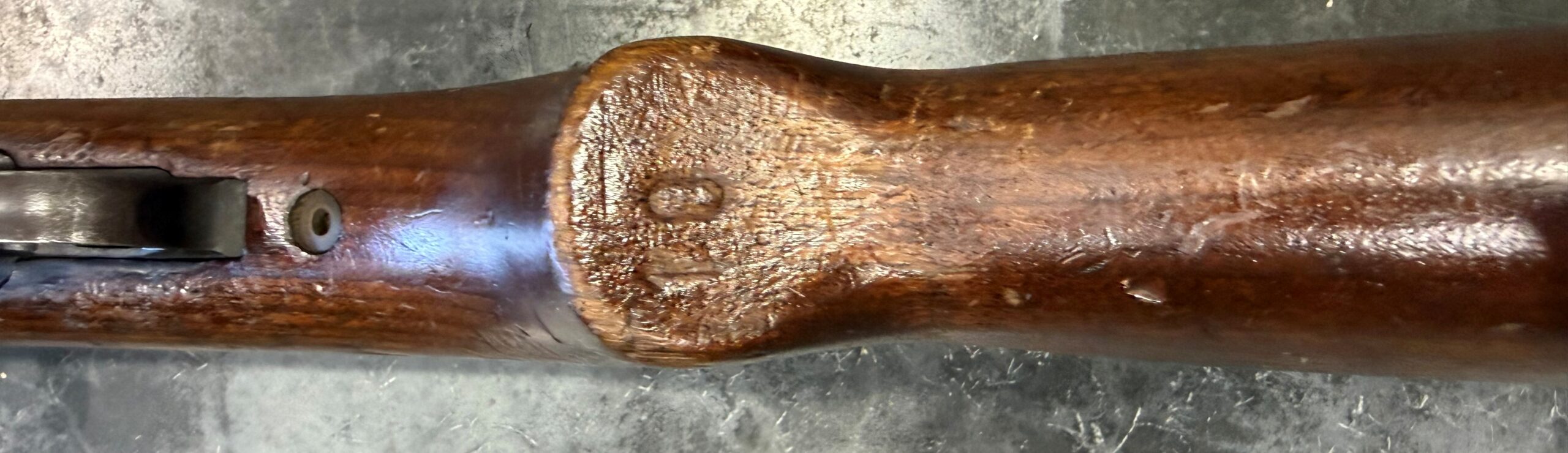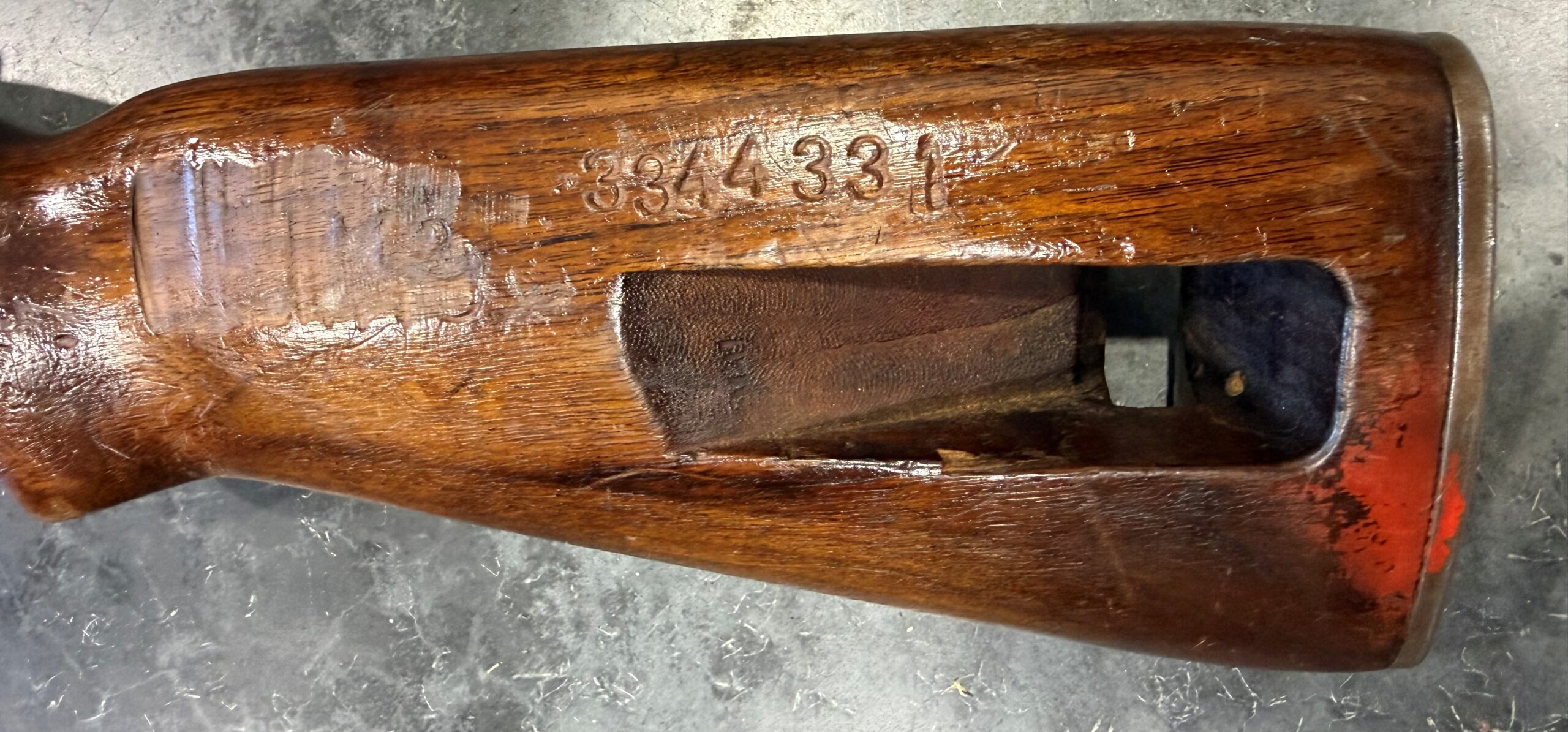 The stock is in very good overall condition with no cracks, however there is a sanding mark on the left side of the stock between the pistol grip and the sling slot.