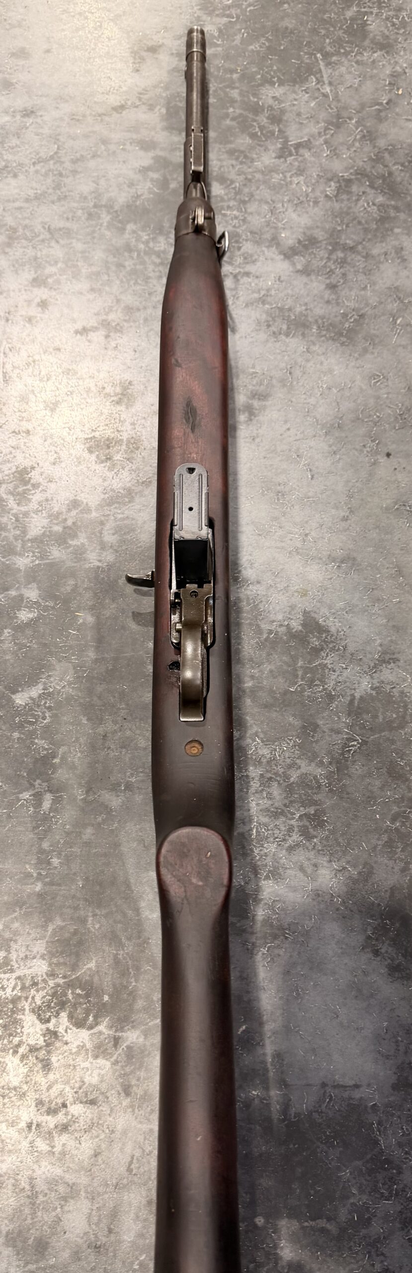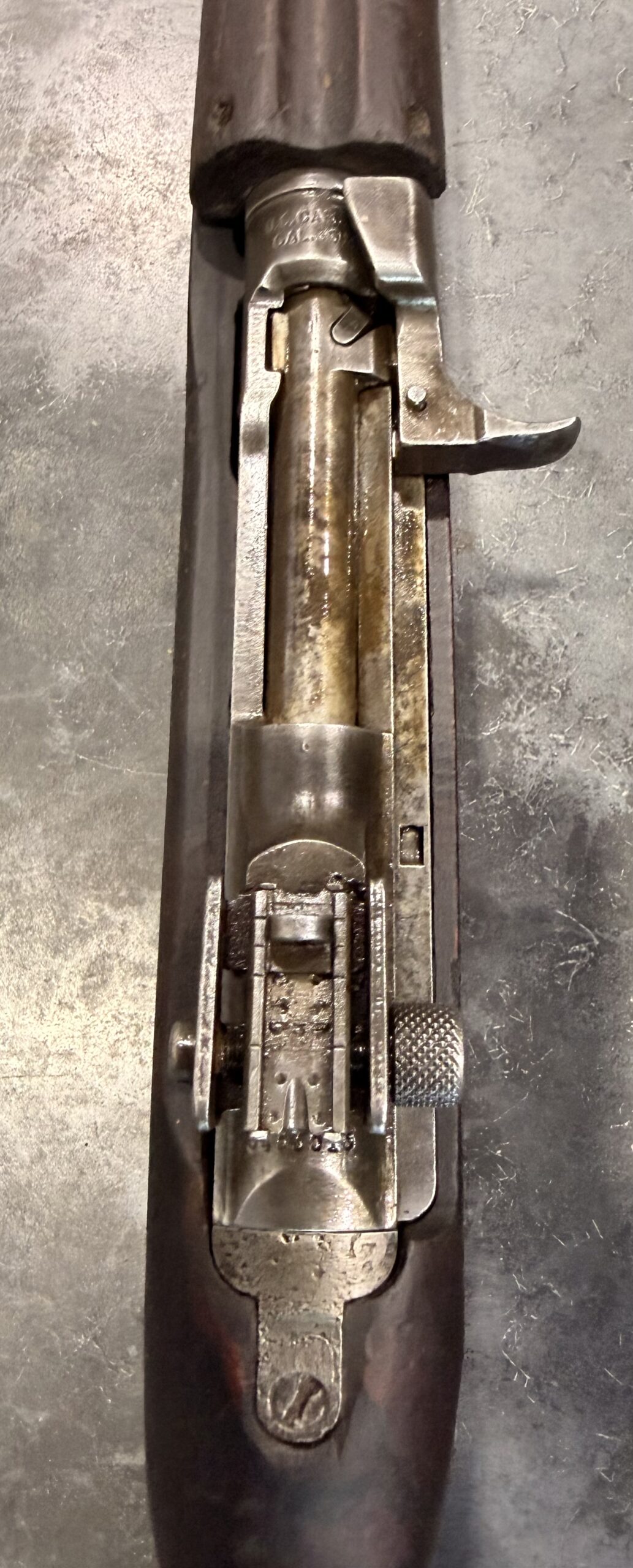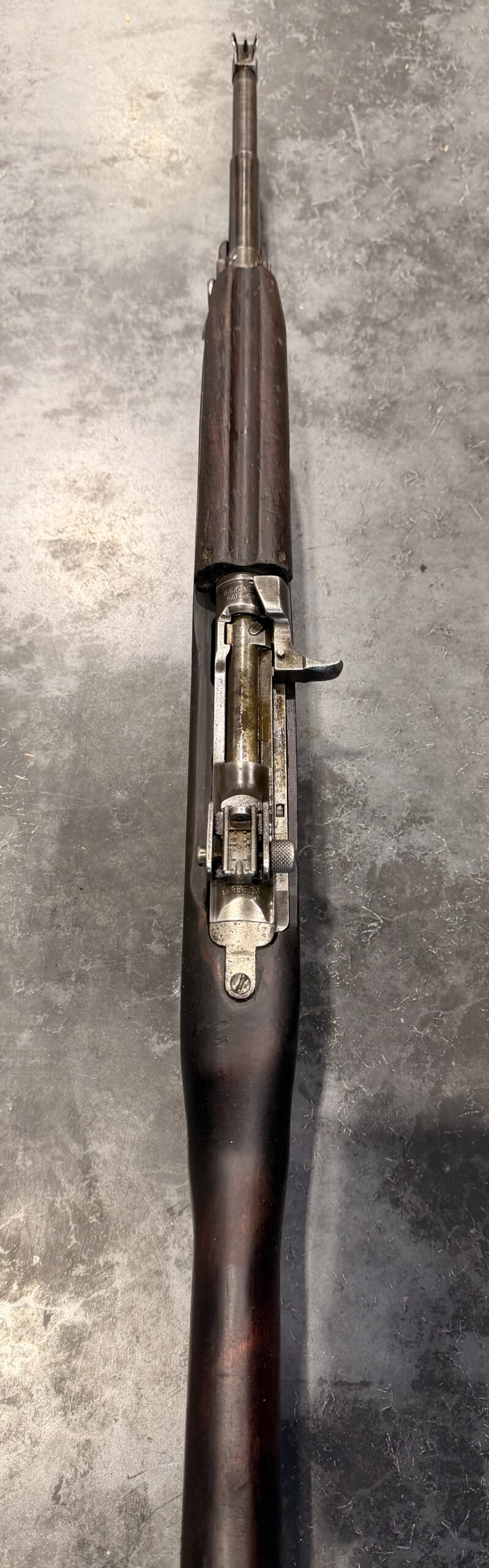 This carbine features a Type 3 rear sight and a Type 3 front barrel band. The receiver, barrel, and trigger group are in good condition.