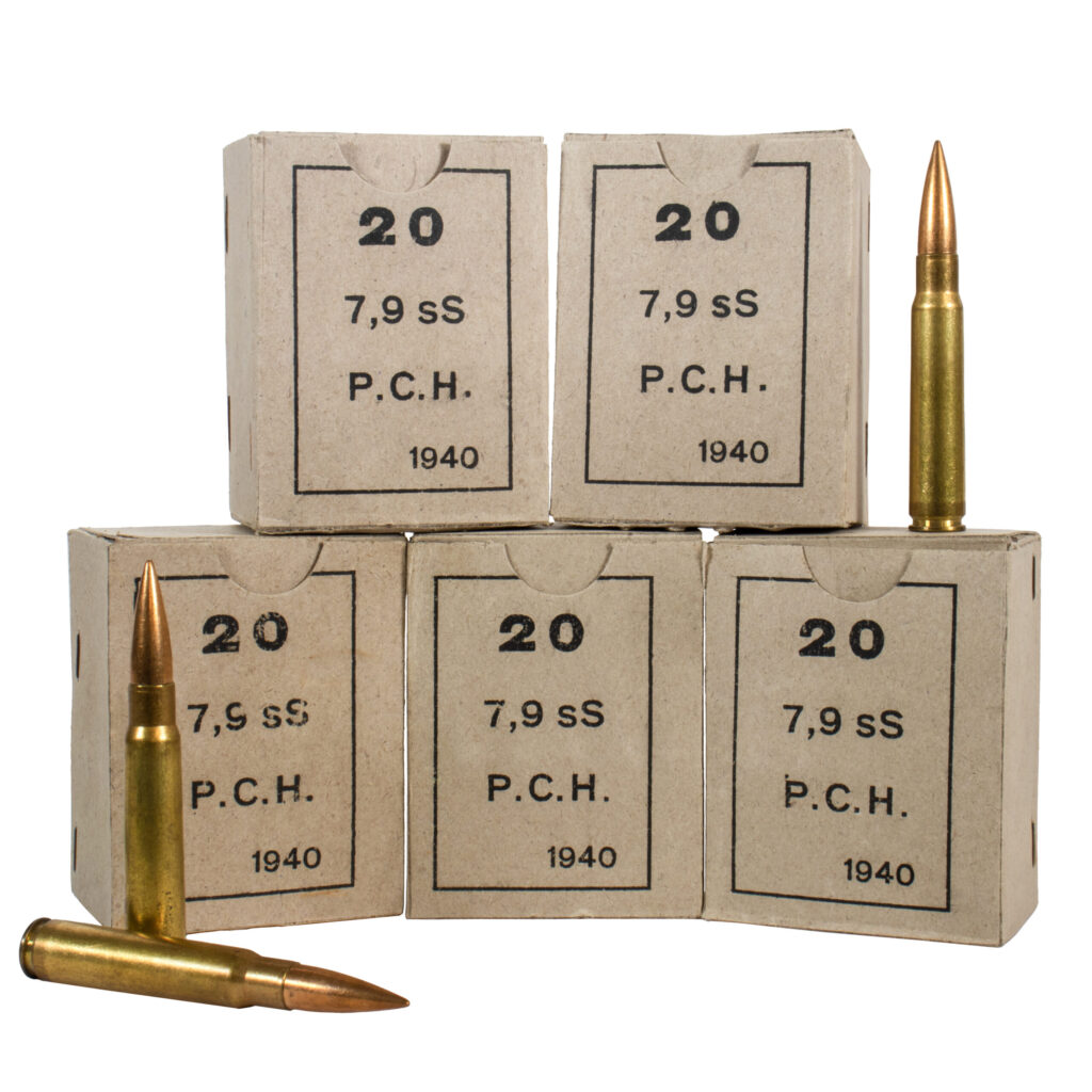 We have for sale Greek 8mm Mauser (7.92×57) 198gr FMJ Surplus Ammo. This ammo was manufactured in the late 1930s by PCH Pouderie Et Cartouche Helene and has the 7.92×57 JS s.S. (schweres Spitzgeschosse) pointed bullet with lead core and bi-metal jacket (attracts a magnet), brass case, and corrosive berdan primer. Comes in 20 rnd boxes.