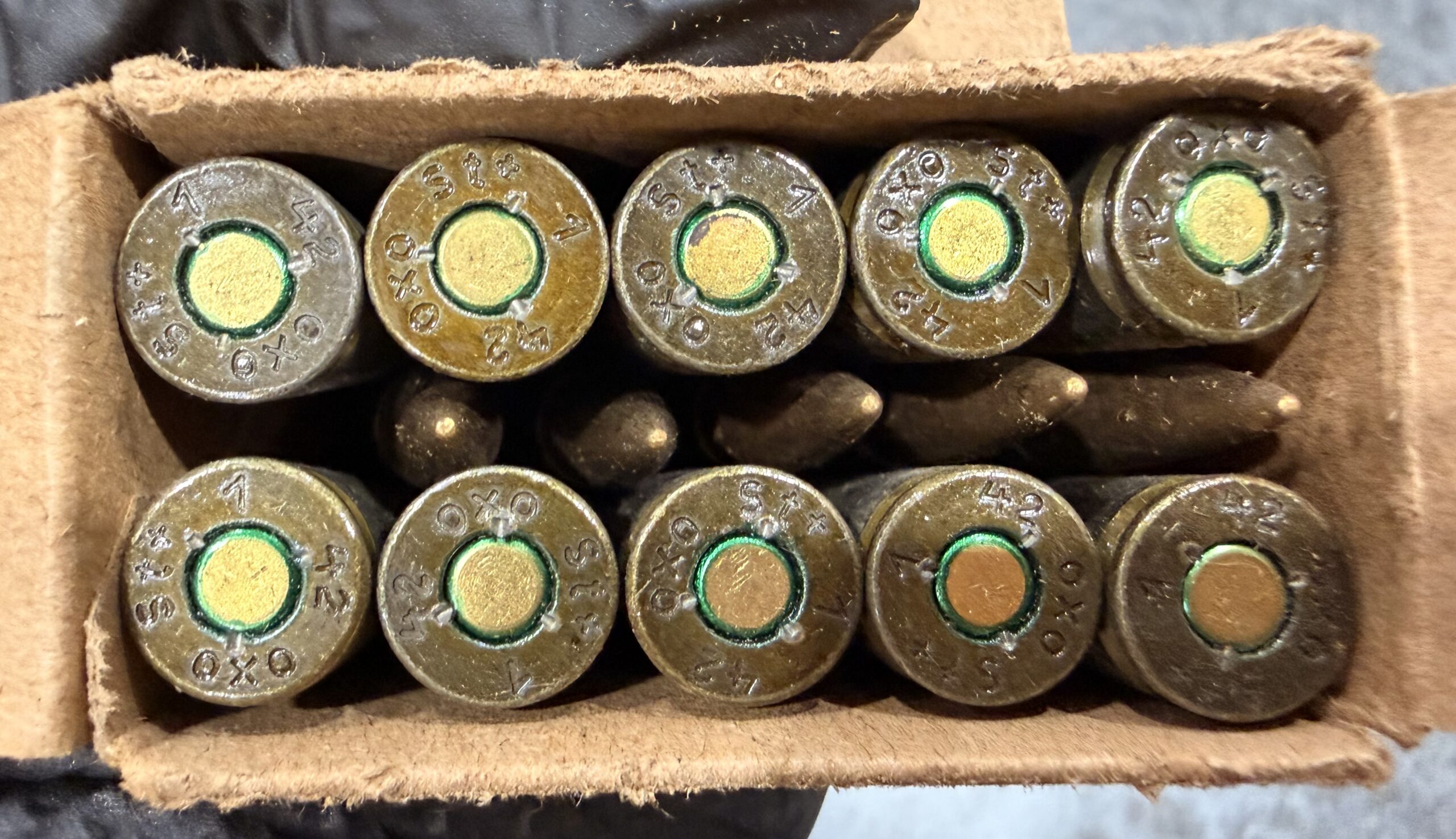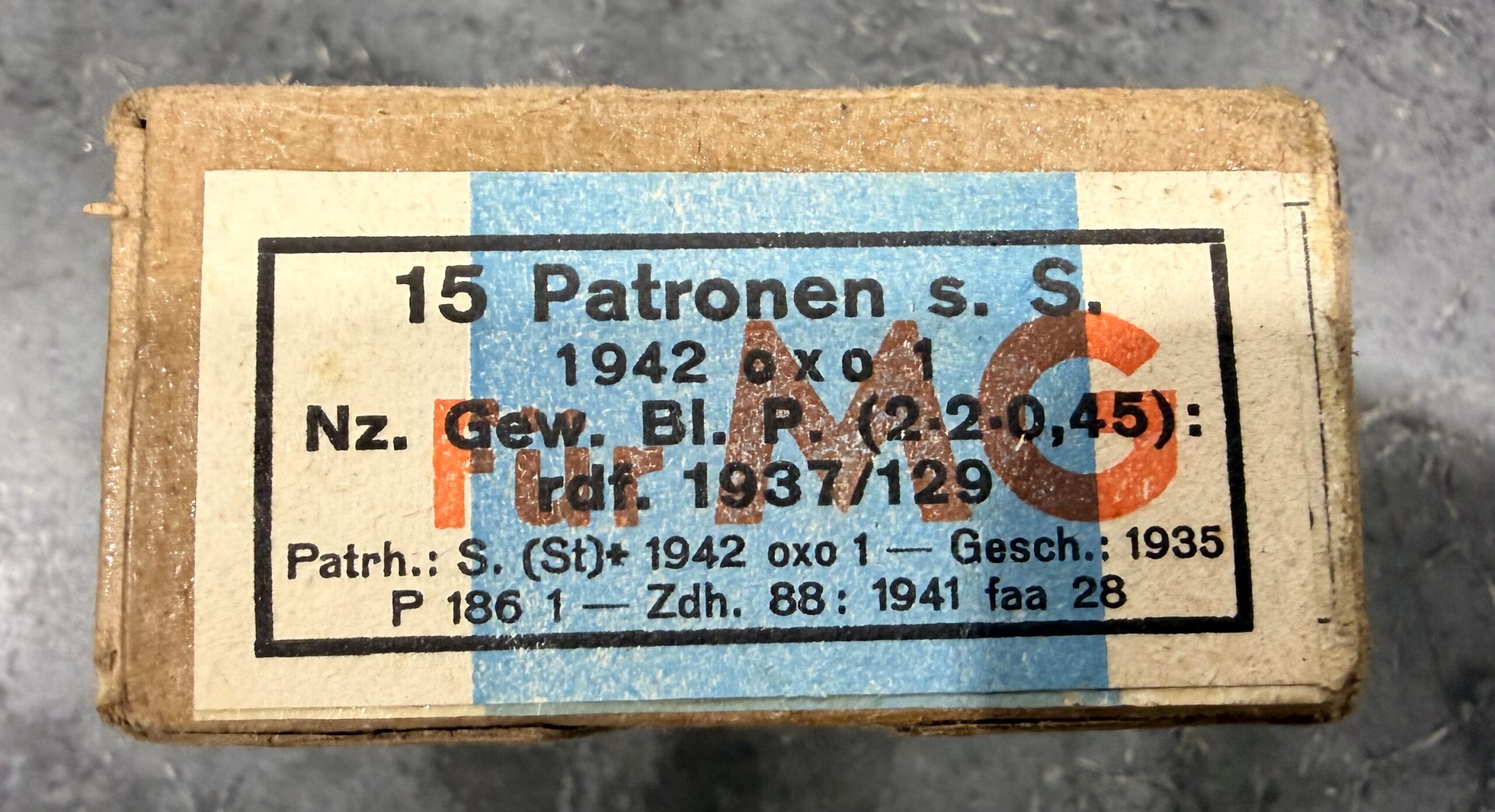 We have for sale German 8mm Mauser (7.92×57) 198gr FMJ Surplus Ammo. This ammo was manufactured during WWII with the s.S. (schweres Spitzgeschosse) pointed bullet with lead core and bi-metal jacket (attracts a magnet), steel case, and corrosive berdan primer. The majority of the boxes and headstamps are 1942 marked and manufactured by Teuto-Metallwerke GmbH, Osnabrück, Hannover (oxo manufacture code). Boxes are “Für MG” marked. Comes in 15 rnd boxes.