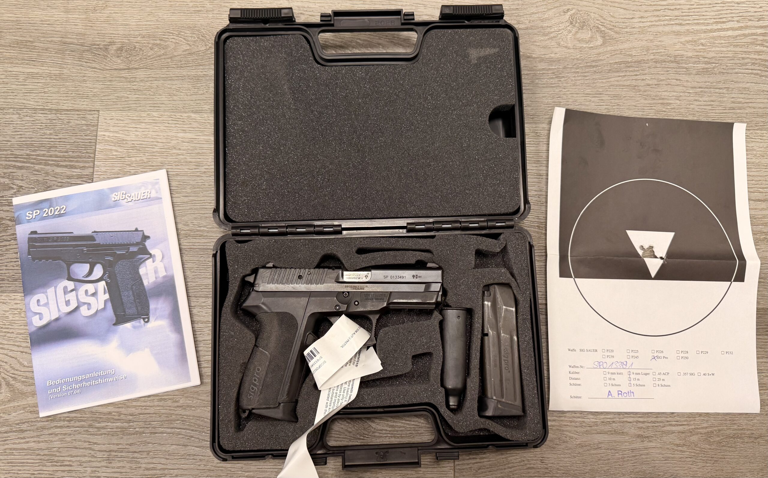 Comes with two 15-round magazines, cleaning kit, manual in German, and a test target. Also includes the original case.