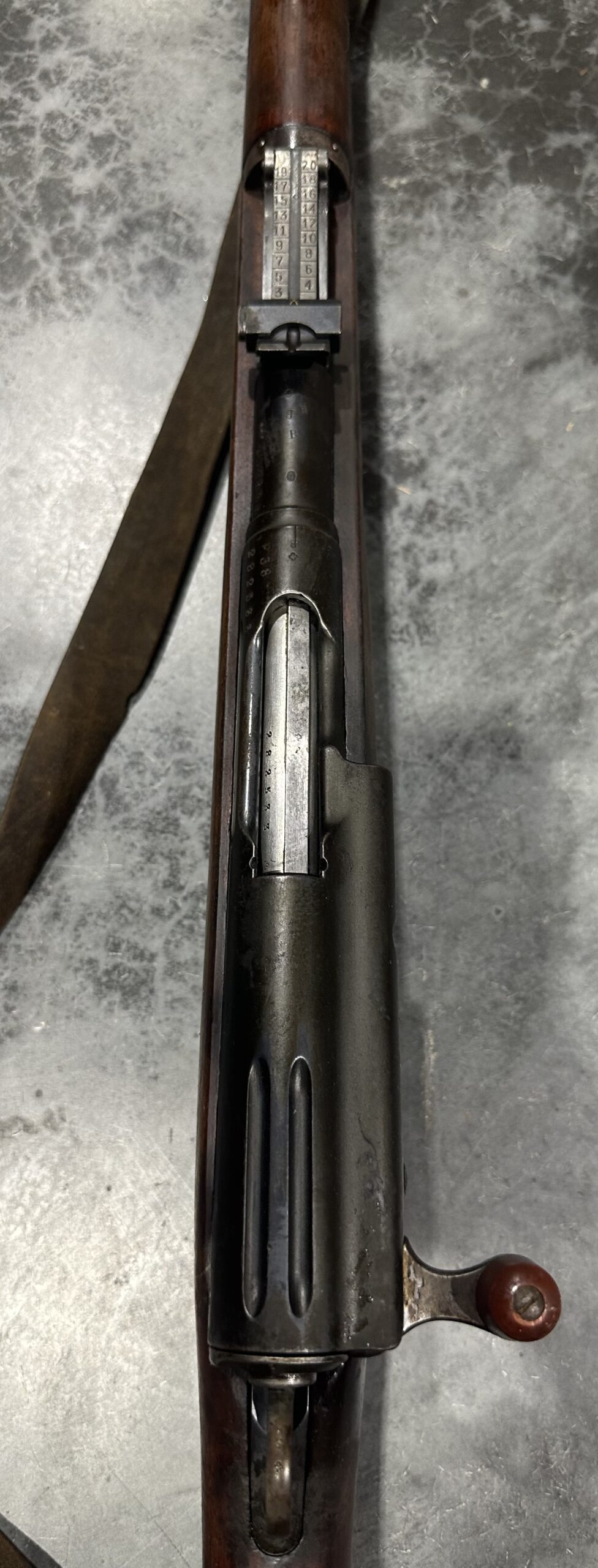 This rifle features matching numbers on the receiver, bolt, and magazine. It is complete, fully functional, and in good condition. The bore is very good, with strong grooves and a clean overall appearance.
