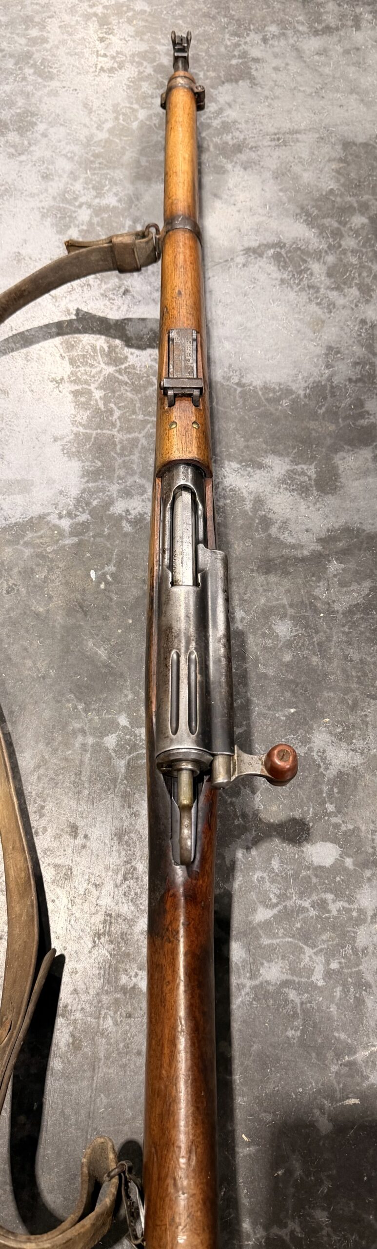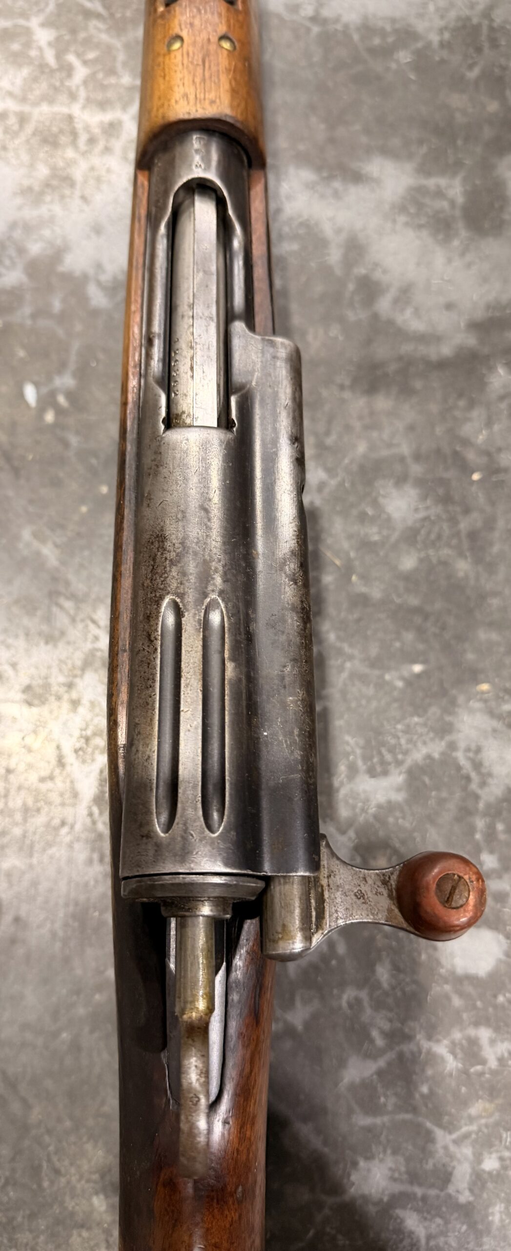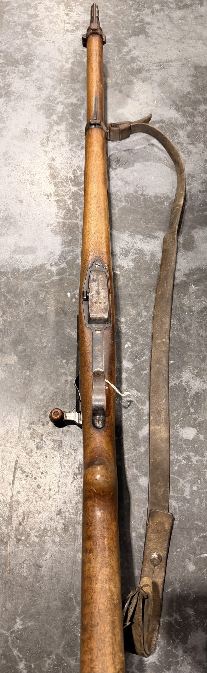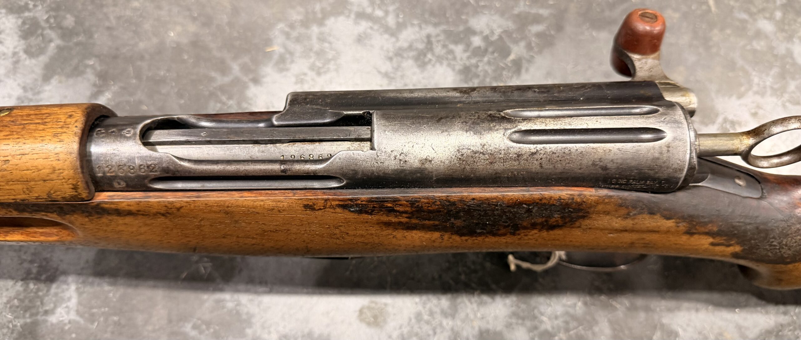 This carbine features matching numbers on the receiver, bolt and magazine. It is complete, fully functional, and in good condition. The bore is in very good condition, with strong rifling and a clean overall appearance. Please note that there is a crack behind the receiver at the wrist and a small crack near the rear sight.