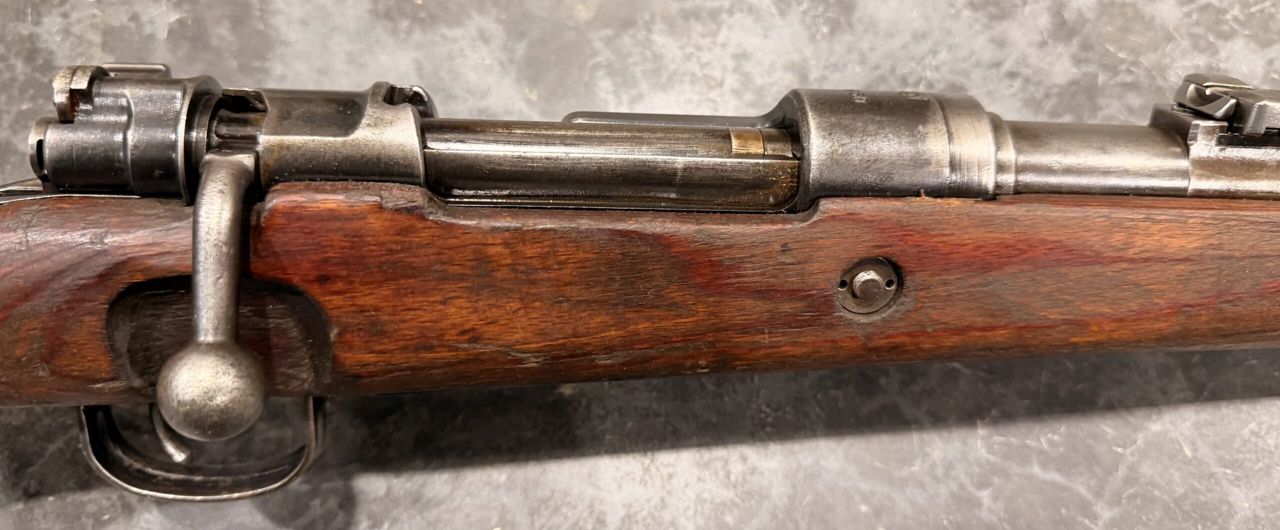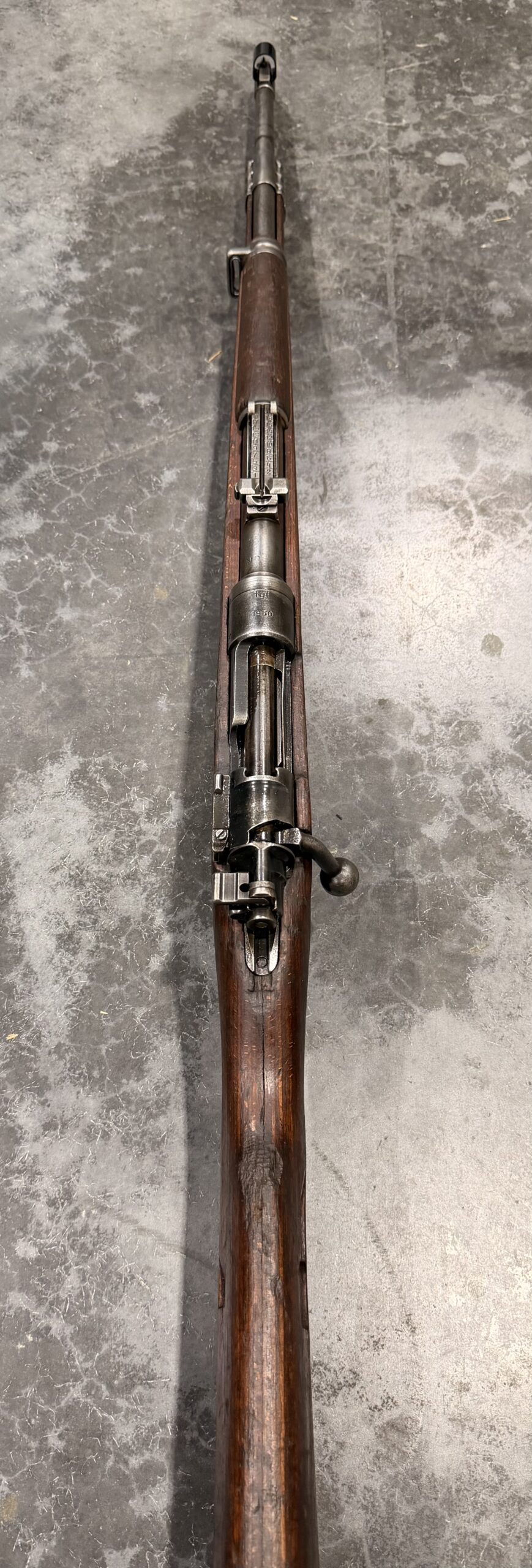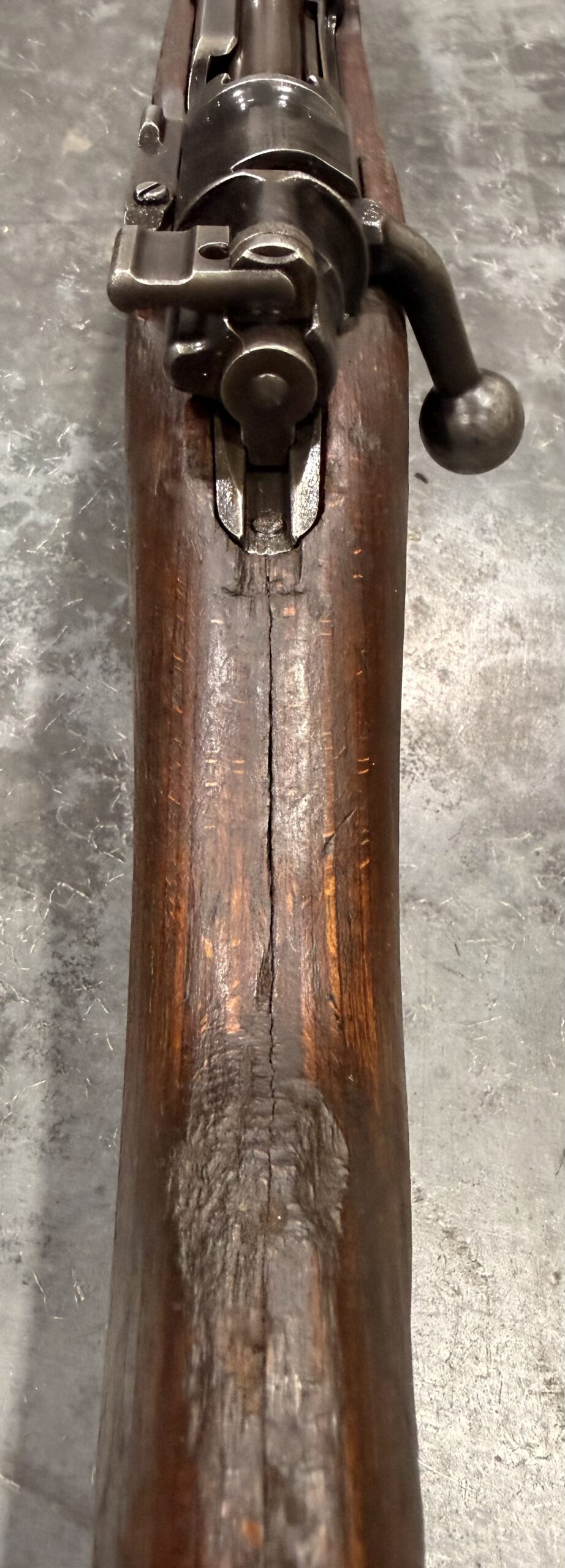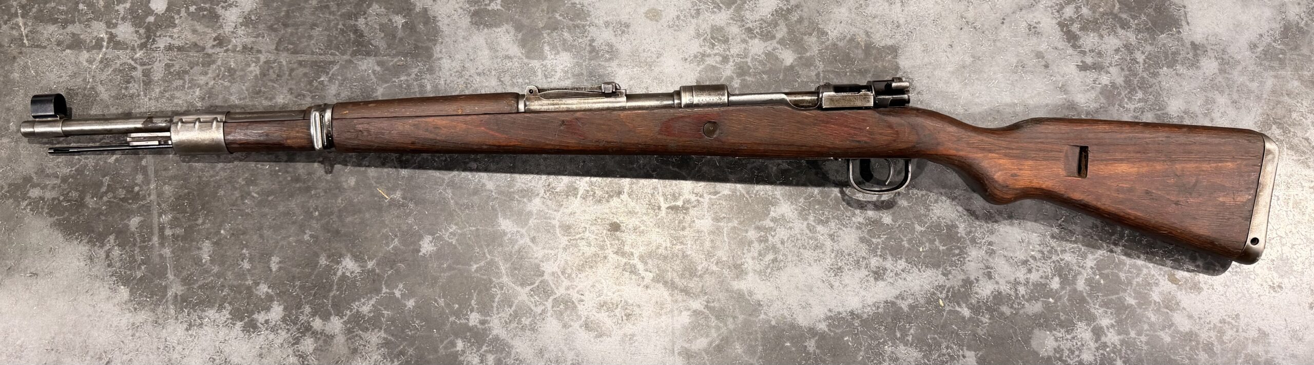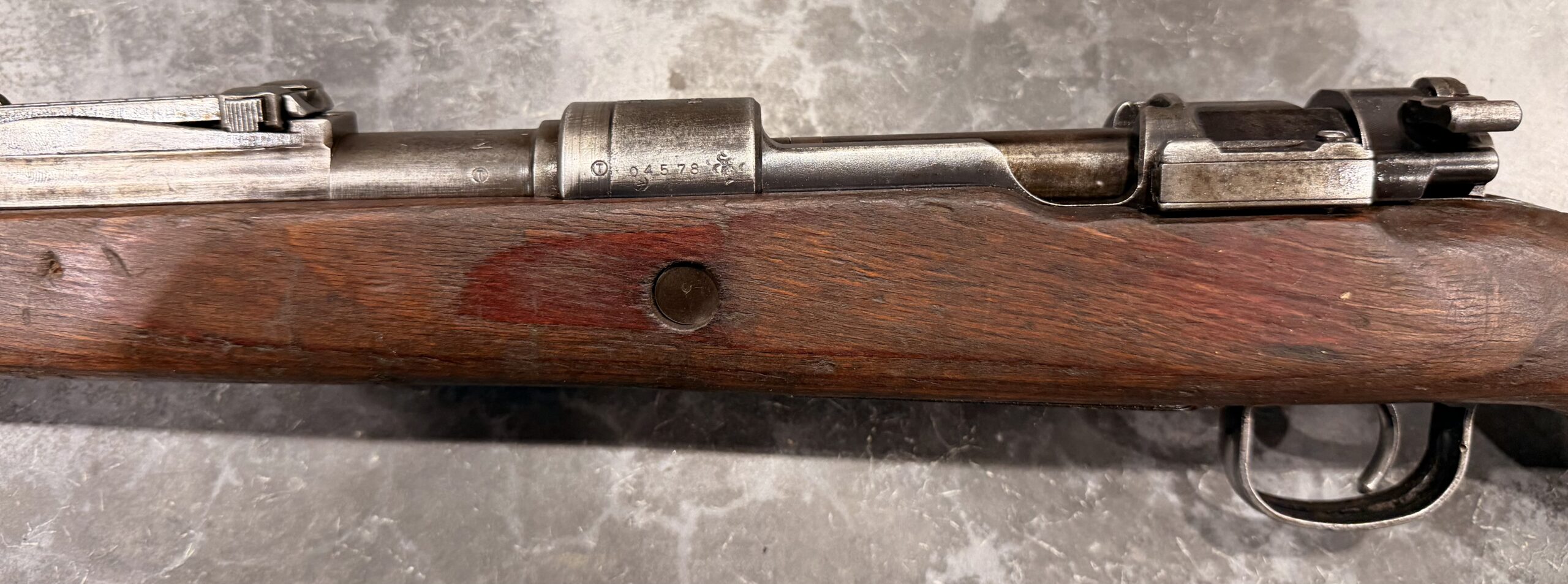 The metal finish is in very good condition, and the wood stock is also in good condition, showing typical handling wear, dings, and scratches consistent with use. Please note there is a crack/delamination behind the receiver at the wrist. The trigger guard, magazine floorplate, and buttplate are unnumbered.