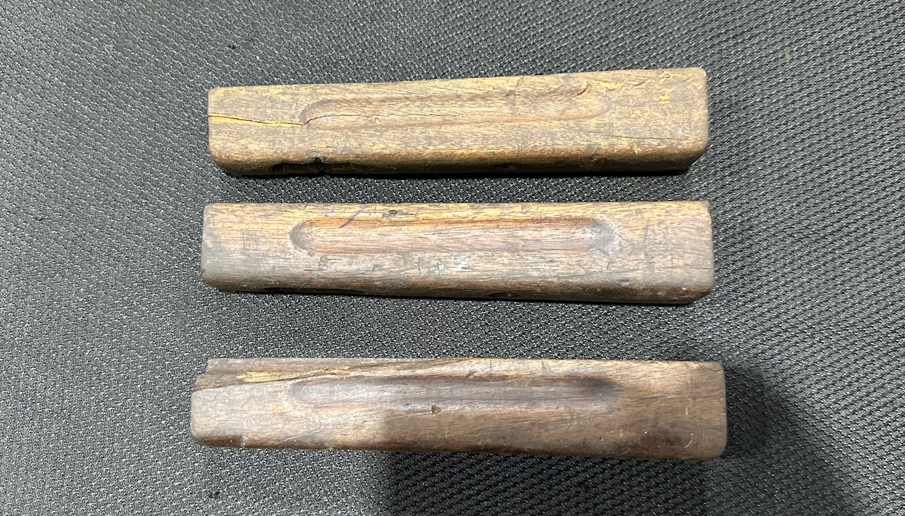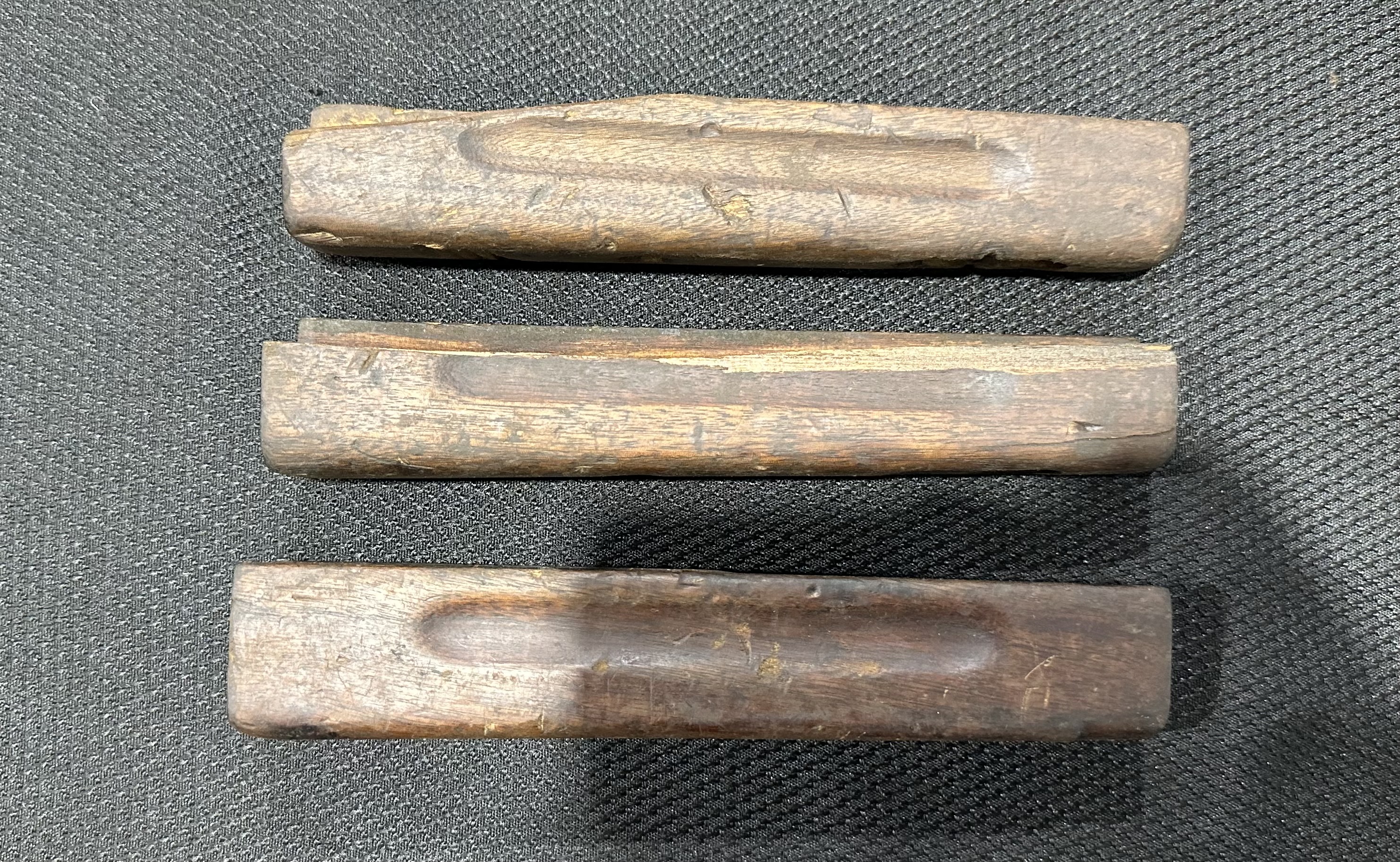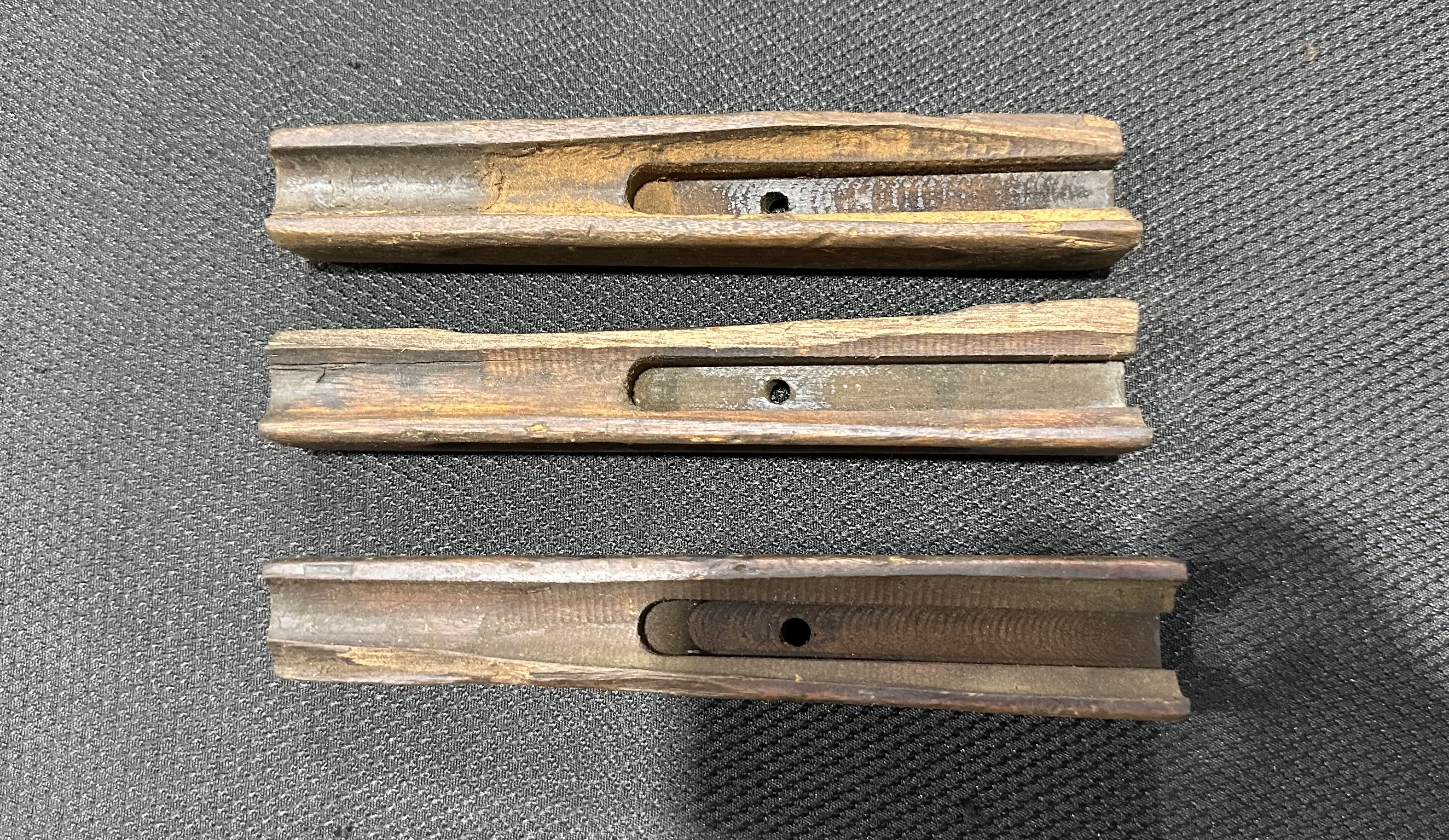 These Thompson M1A1 / 1928A1 front handguards are in fair condition, showing wear and cracks. Some may have chunks of wood missing. No metal hardware is included.