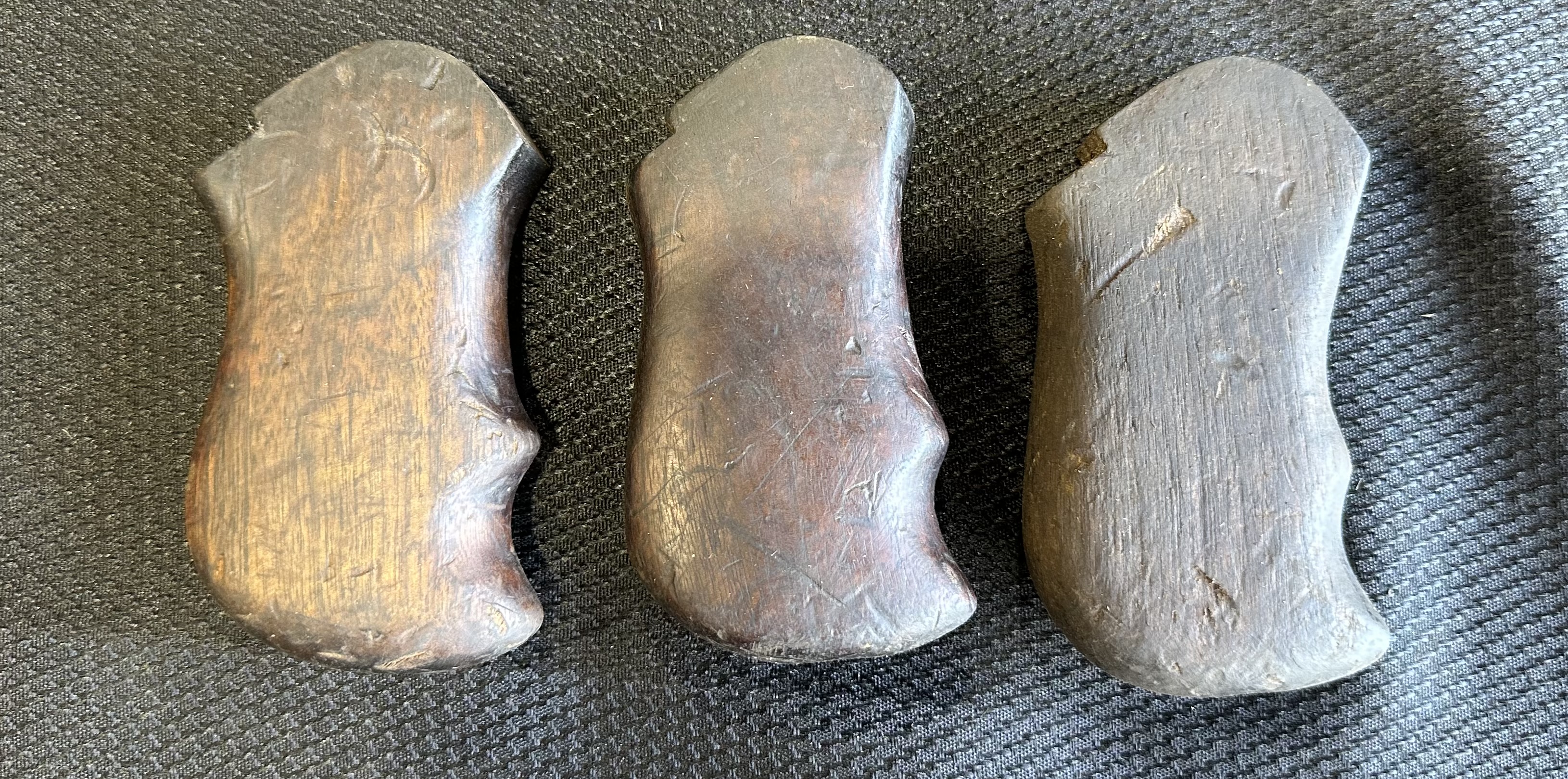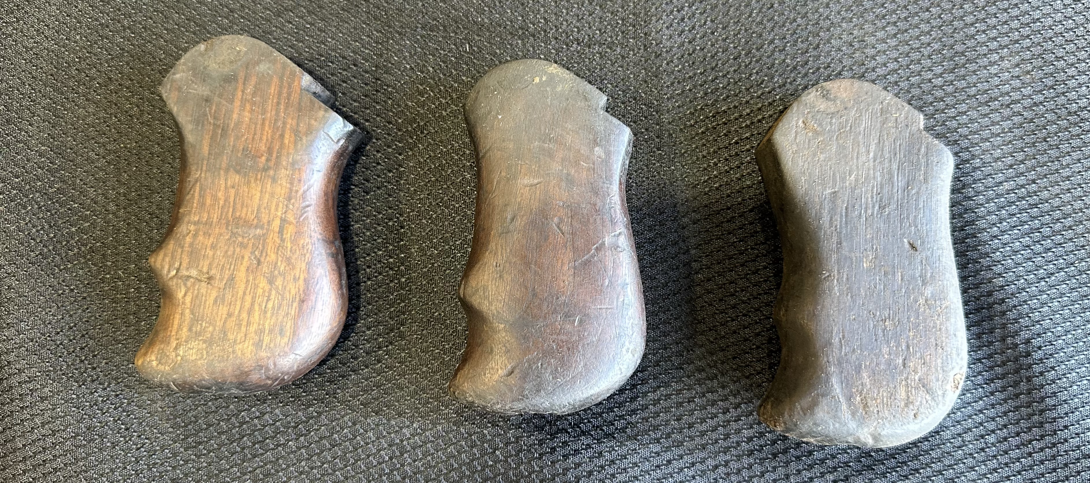 These Thompson M1A1 grips are in fair to good condition, with no major cracks or large chunks of wood missing. Some may have small dents and dings.