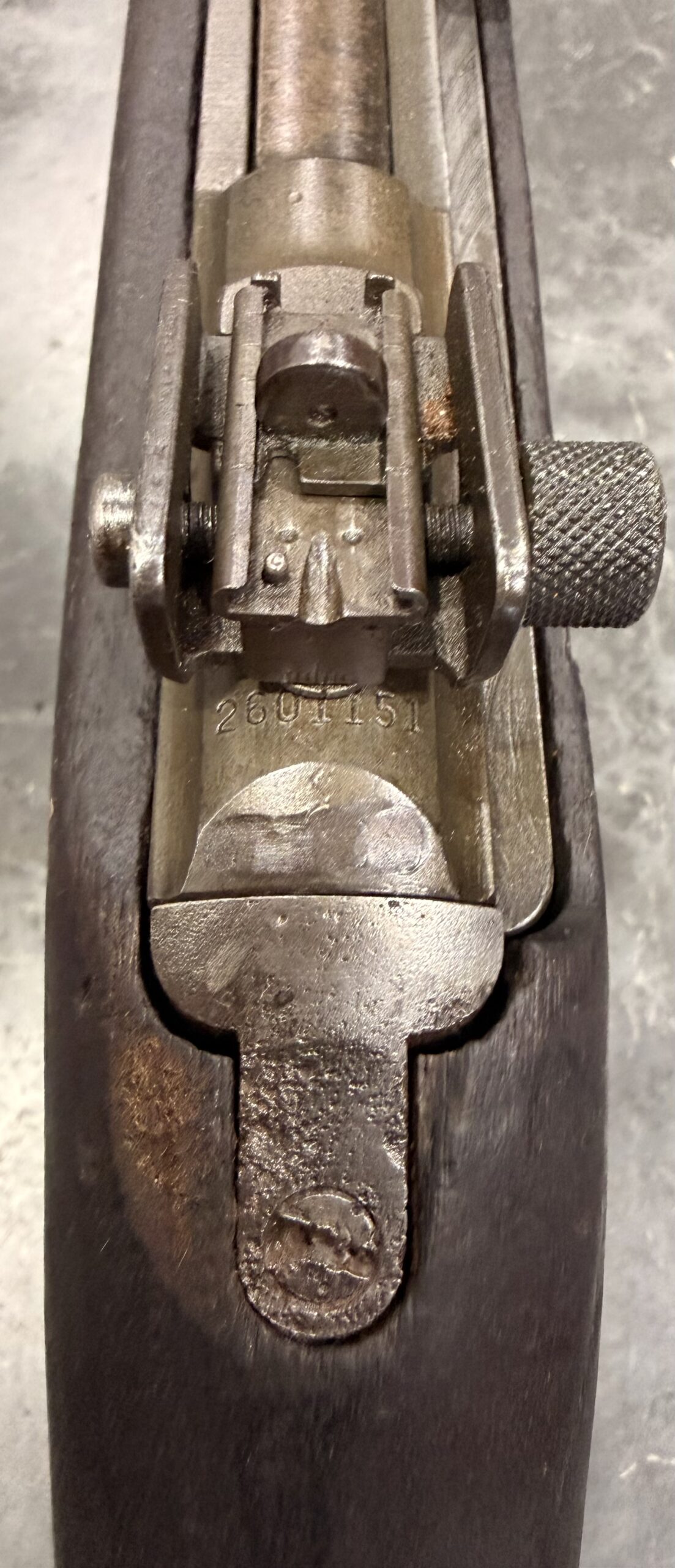 This carbine features a Type III rear sight, a Type III front barrel band. The receiver, barrel, and trigger group are in excellent condition. Please note that the front sling swivel is damaged.