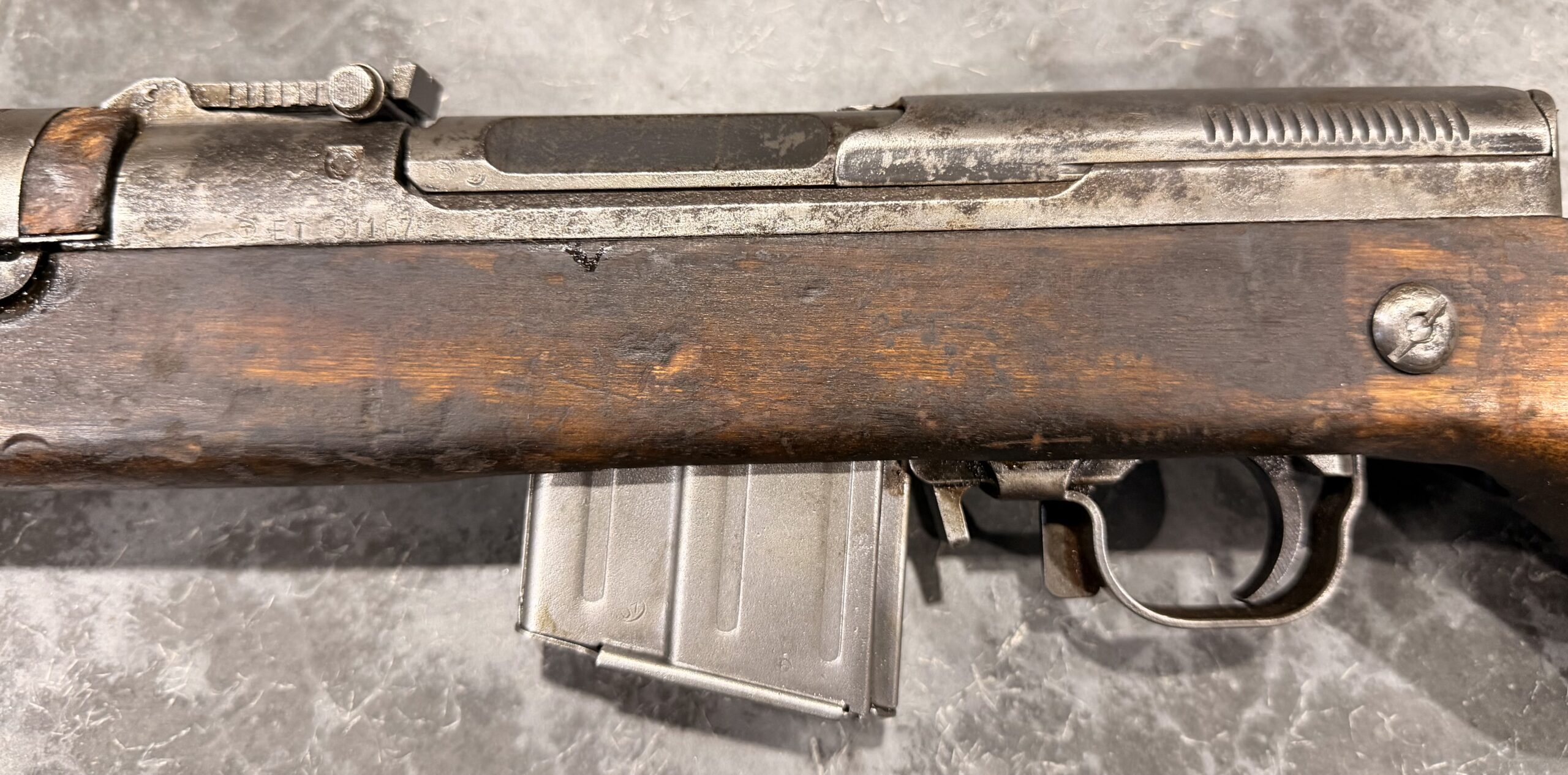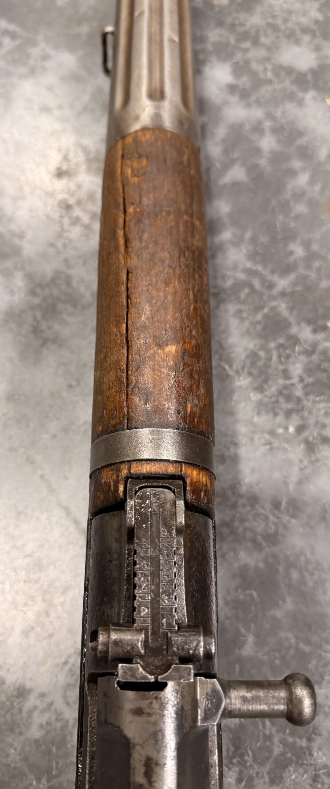 Please note: there are a few cracks on the right side of the stock and one crack on the upper handguard.