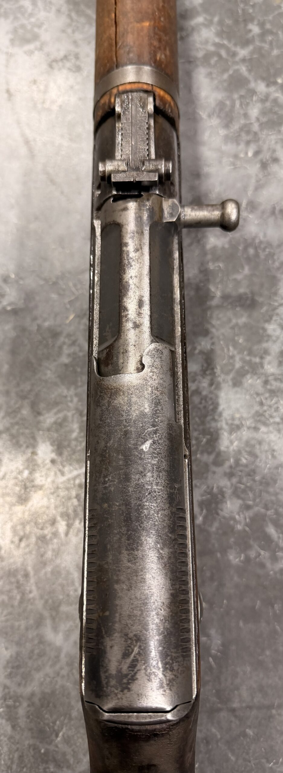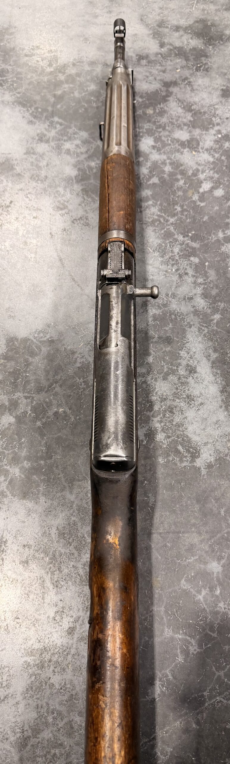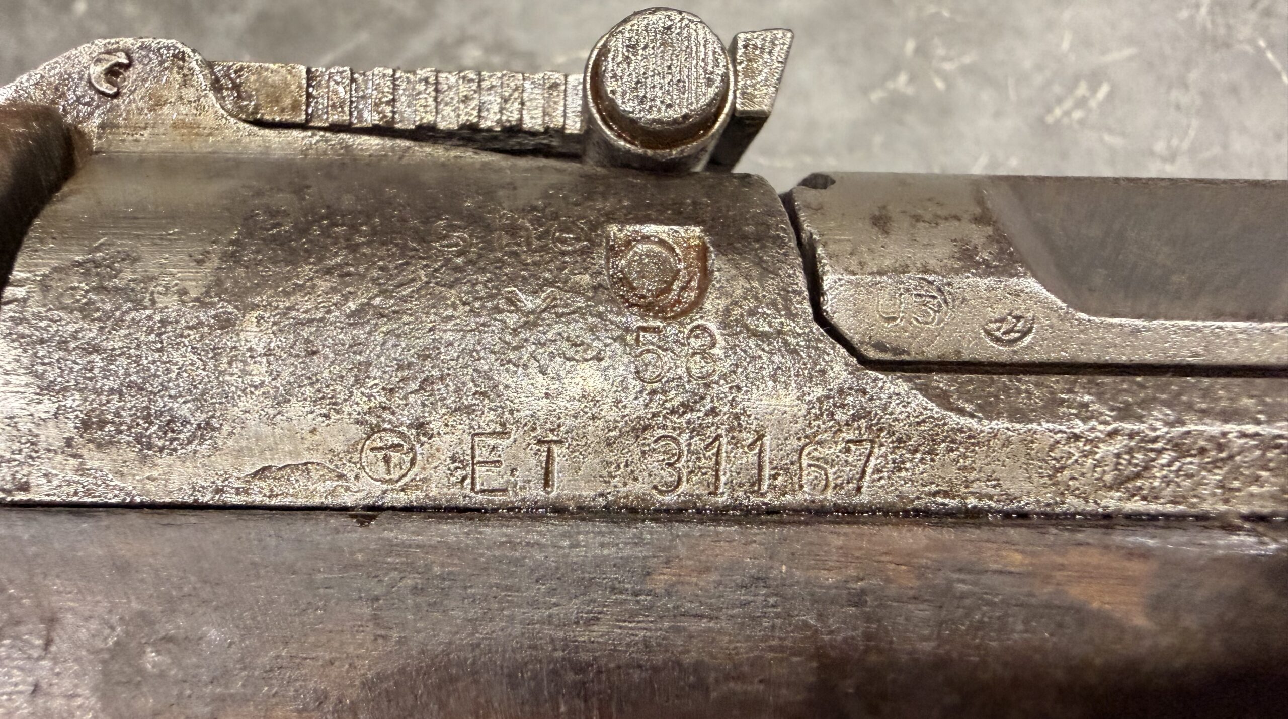 This rifle was manufactured in 1958. The bore is in good condition with strong lands and grooves; however, please note there is a very slight bulge near the muzzle. The metal finish is in fair condition, with some pitting on the receiver, barrel, and bayonet. The wood shows typical handling wear, including dings and scratches from use.