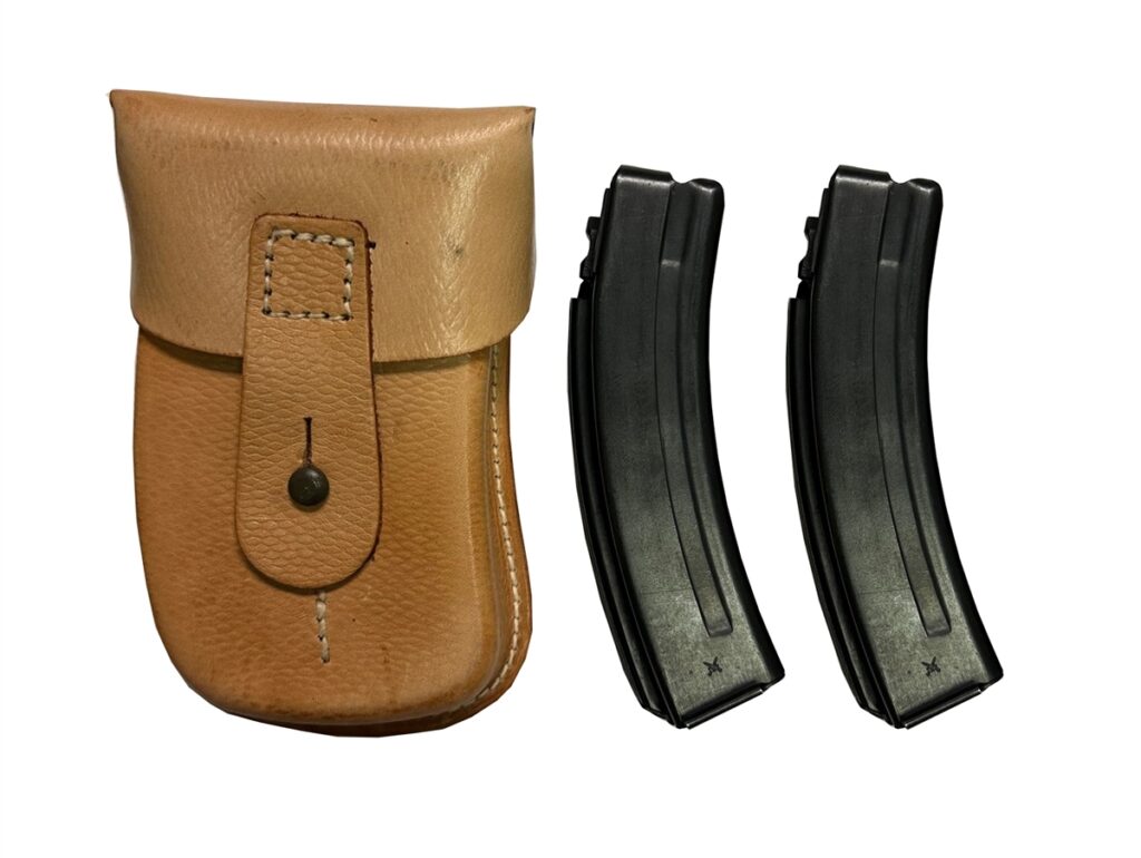 Original Czech VZ 61 Scorpion magazine pouch in excellent to unissued condition with 2 excellent to unissued 20rnd magazines! Each pouch holds the 2 20 round VZ 61 Scorpion magazines included. .32 ACP magazines, not for the .380 guns. All pouches were manufactured for the Czech military and are authentic military surplus.