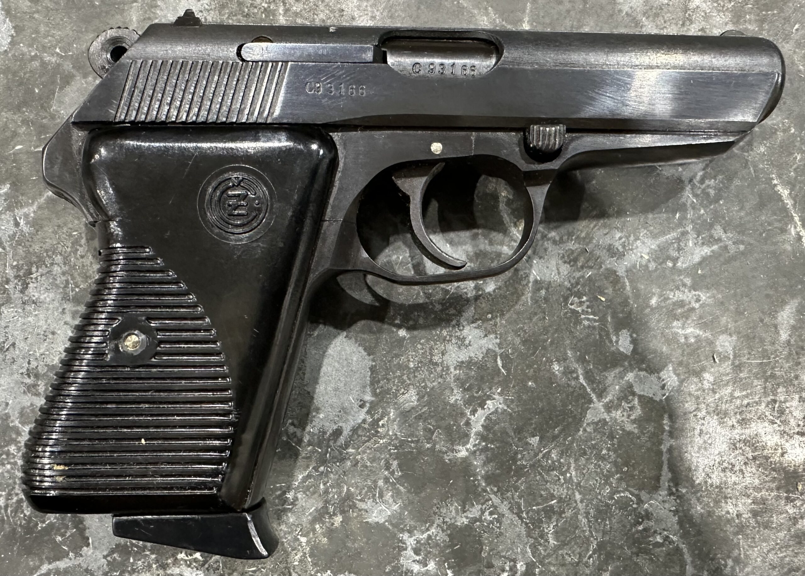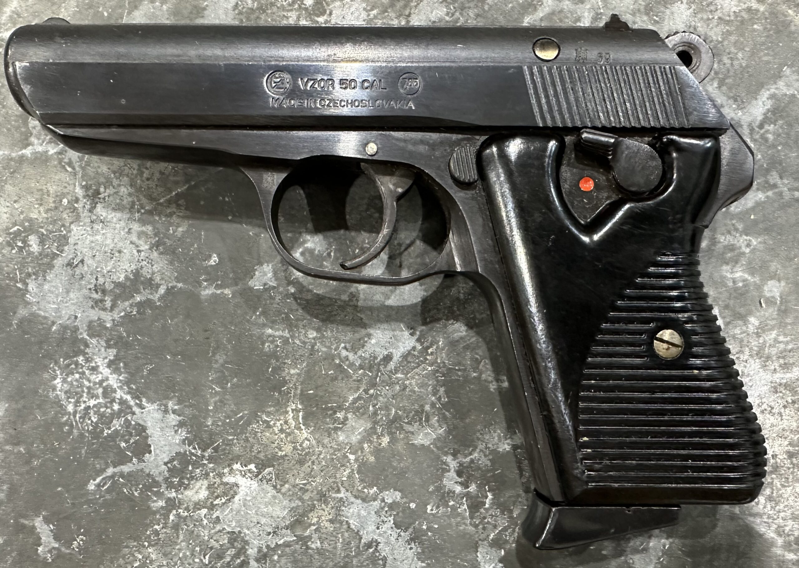 Czech VZ50/CZ50 pistol chambered in .32 ACP, serial number C93166. This pistol is in excellent condition, with minimal surface wear. The grips are also in very good condition with no cracks. The bore is excellent with strong grooves. The pistol is numbers matching frame and slide. The pistol is 100% functional and comes with one magazine. The pistol is import marked on the rear strap underneath the hammer on the frame.