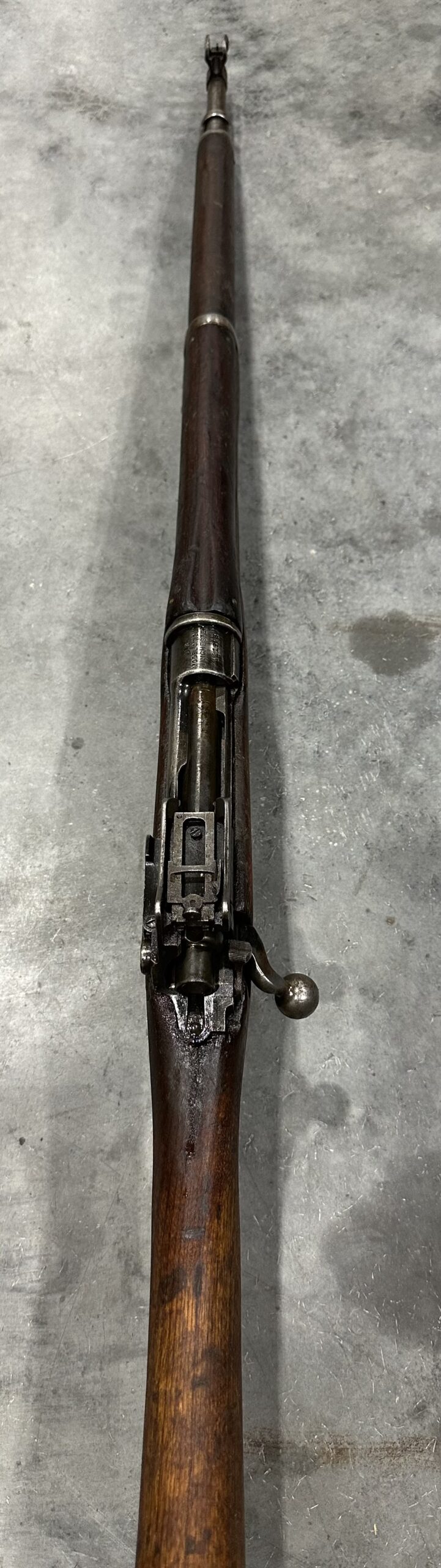 This rifle was manufactured by Winchester. The bore is in good condition with strong rifling; however, it gauges at 4.5. The rifle is complete, fully functional, and has been test-fired. The barrel is Winchester-marked and dated 1-18. The wood is in good condition, showing typical dings and dents from use. Please note there is a small crack behind the receiver at the wrist.